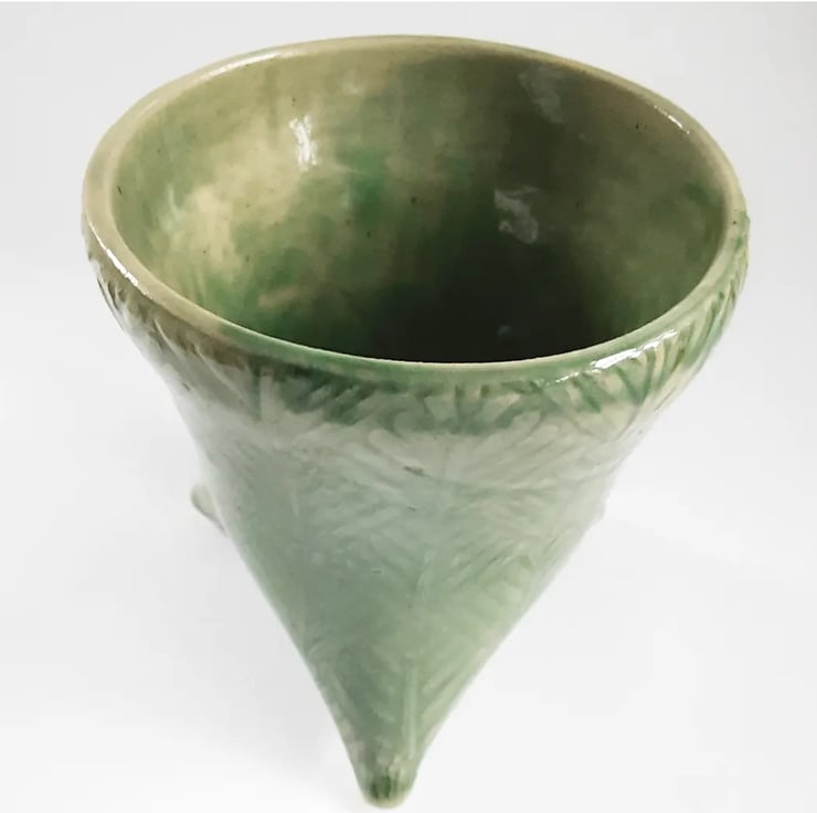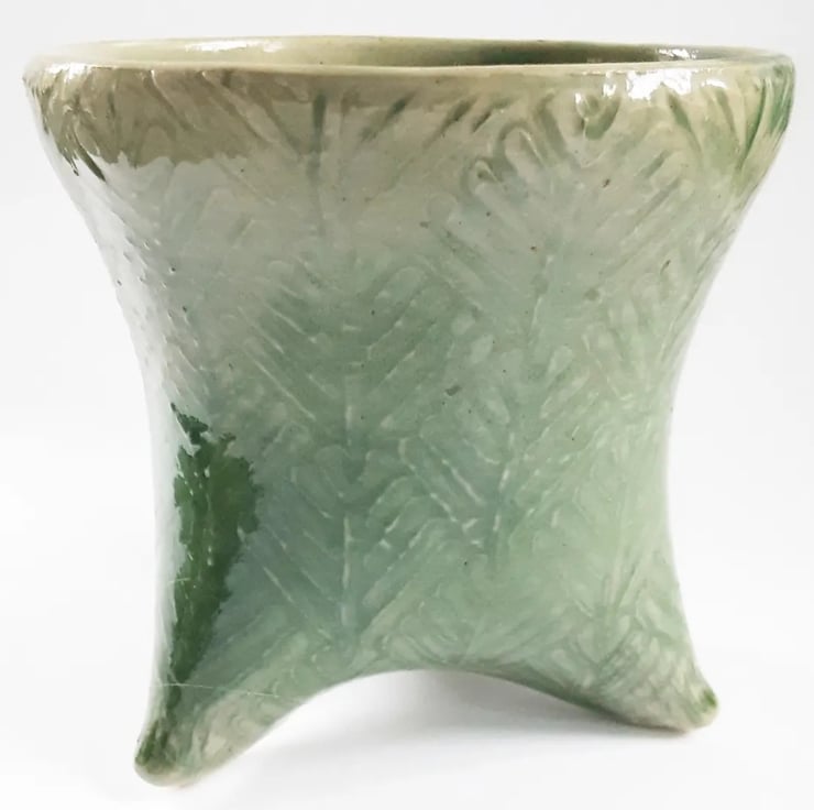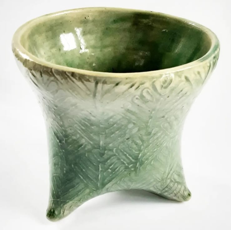 Glazed in green glaze on the outside and inside. It has a pattern around the outside