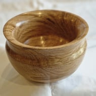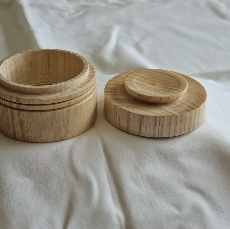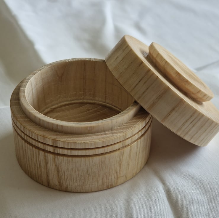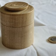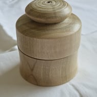 This little box is turned on a lathe from a single piece of ash wood and the grain pattern in the box and lid are matched. It is ideal for keeping rings, other jewellery, coins and small trinkets etc. The exterior of the box has been sanded and has been brought to a glossy finish with pure beeswax. The box measures 52mm high and is 67mm in external diameter. Weight is 89g.