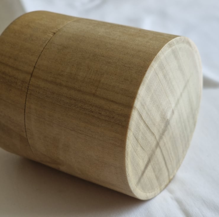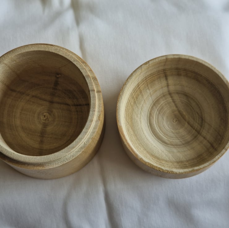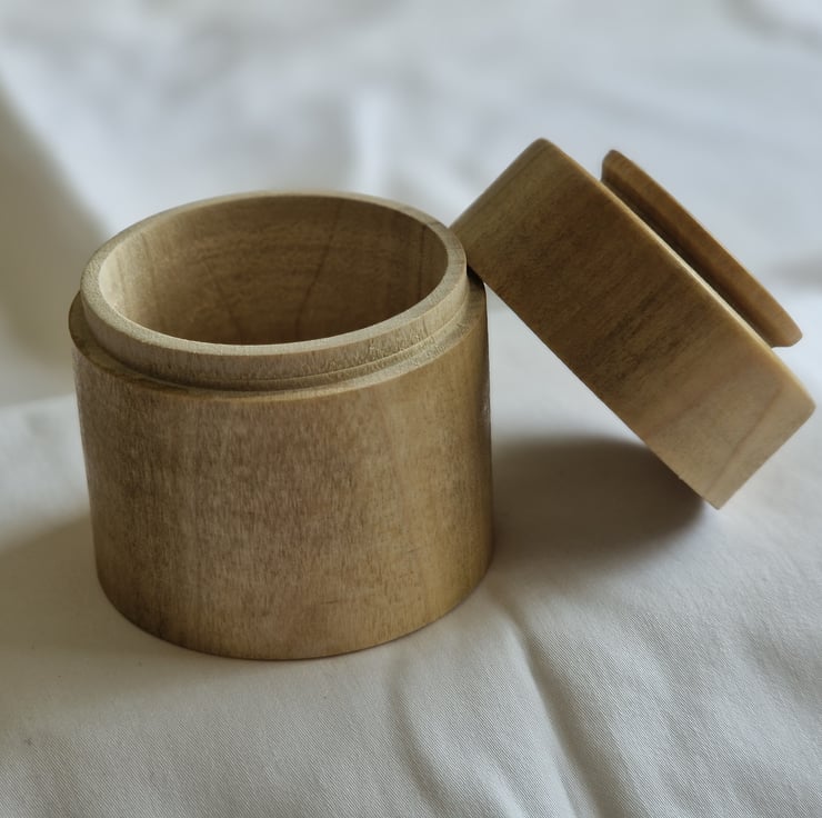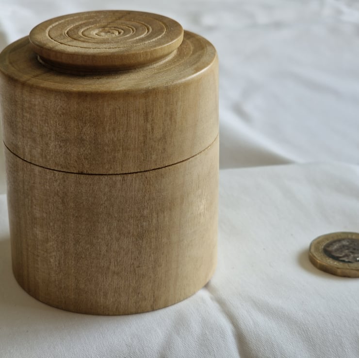 This little box is turned on a lathe from a single piece of wood. It is ideal for keeping rings, other jewellery, coins and small trinkets etc. It was completed by sanding and the application of a wax polish to give a satin finish. The box measures 67mm high and is 58mm in external diameter. Weight is 55g
