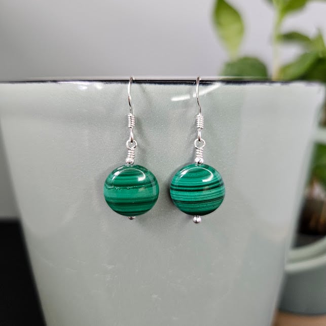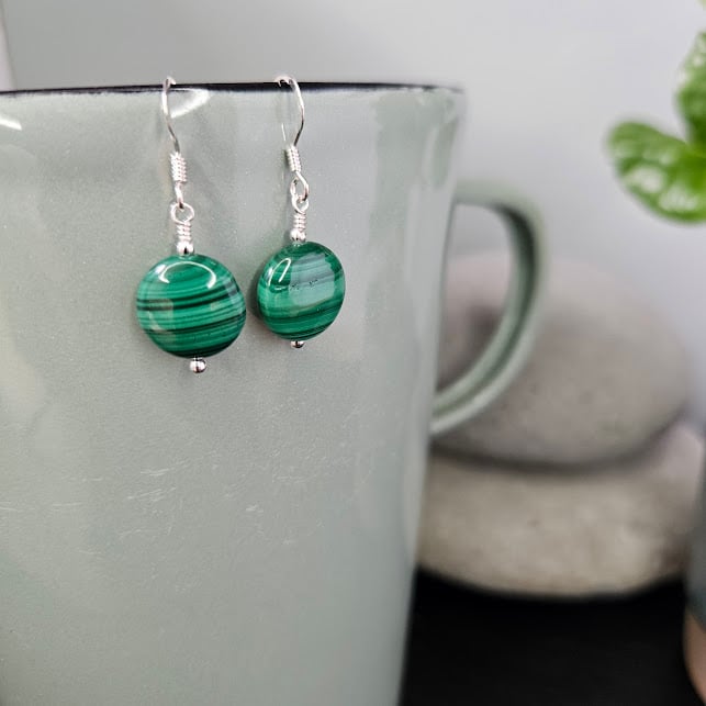These pretty earrings are made with natural malachite which has been pressed in to 1.2cm coin-shaped beads. The beauty of the gemstones are enhanced by simple round sterling silver beads and ear hooks. The different colours and patterns of the malachite beads make every pair of earrings quite unique.