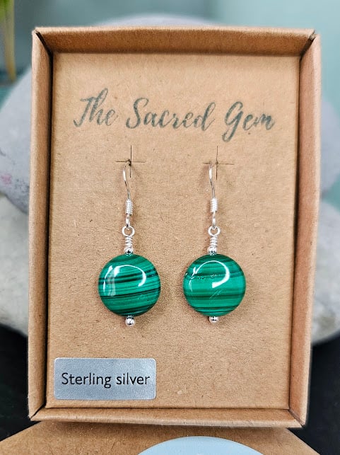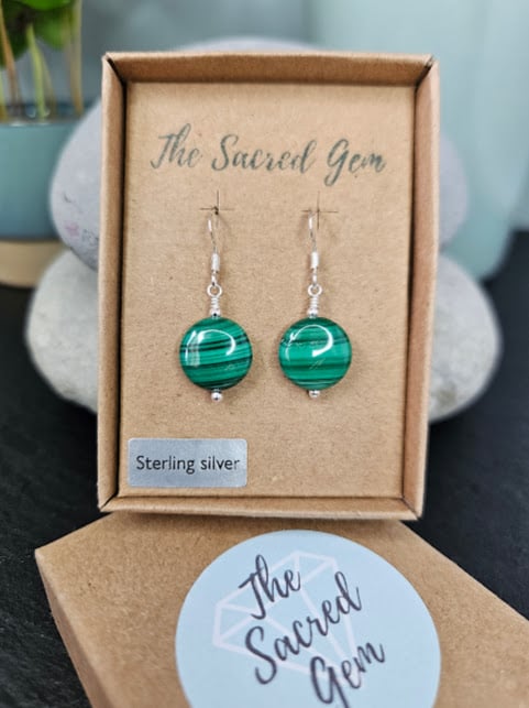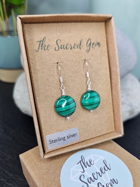 The earrings come carefully packaged in a kraft gift box which is made from 100% recycled card. Underneath the box insert, you will find a small poly bag for storage and an anti-tarnish strip to help keep the silver shiny. You will also receive a Sacred Gem gemstone card highlighting the meanings associated with malachite. On the reverse of the card are some simple jewellery-care guidelines.