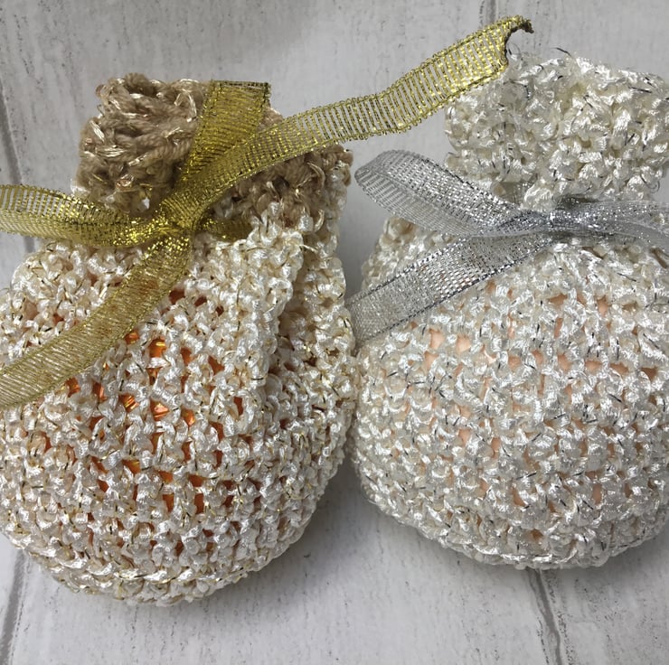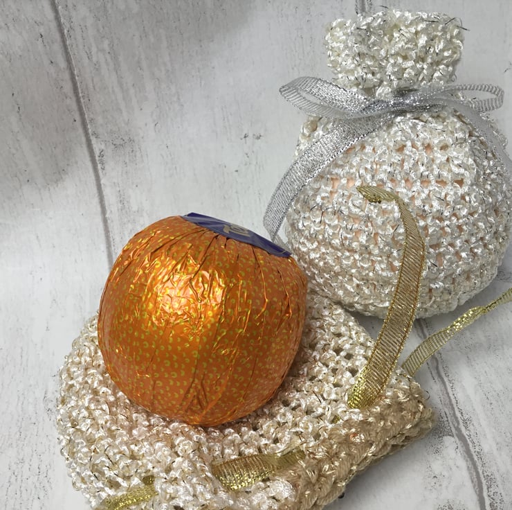 I had a lot of odd balls of yarn and lengths of ribbon which, when combined, made lovely combinations. This set of 2 hand crocheted gift bags are the ideal size for a chocolate orange, bath bomb or other small gift. Pop the gift inside, tie the ribbon and then put under the tree, or use as 'favours' on your dinner table or as a party gift bag.
