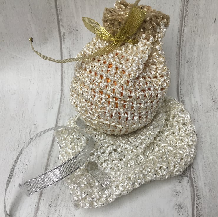 This listing is for a set of 2 bags. They are both made from a white ribbon yarn, one paired with silver thread and the other with gold. Matching ribbons are threaded through the neck of the bag so that they can be tied closed.