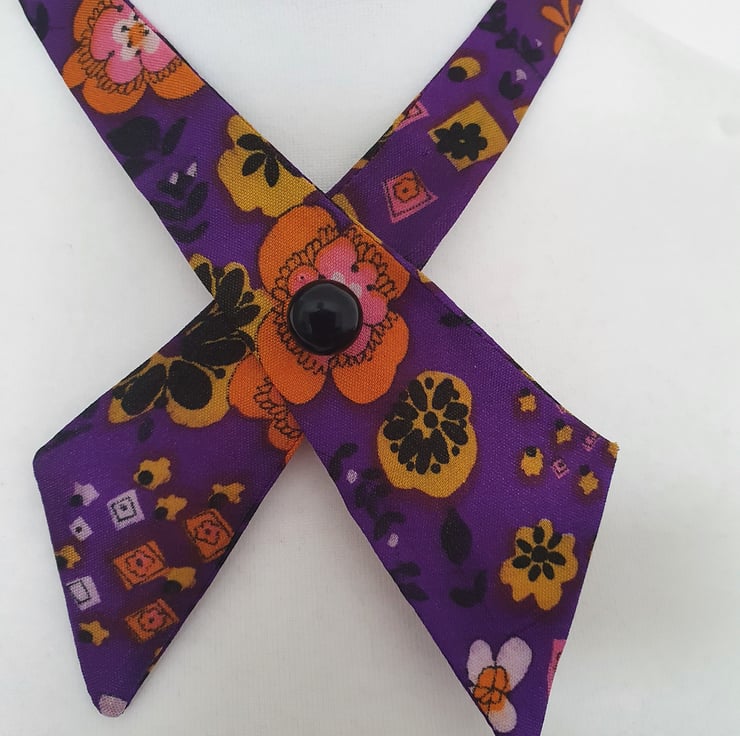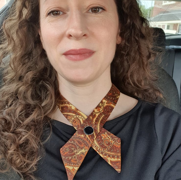 Momo Handmade supports circular, sustainable fashion, and these ties are upcycled from genuine vintage cravats. Each tie is 1 of a kind. This tie is fully self adjusting and it has a pin as closure so you can decide how to 'pin' your tie as in the video. This quirky tie looks good with a shirt or just with a plain top to make the tie stand up.
