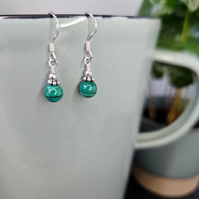 These pretty earrings are made with 6mm round, natural malachite beads and are complimented with sterling silver Bali flower-shaped spacers, beads and ear hooks.
