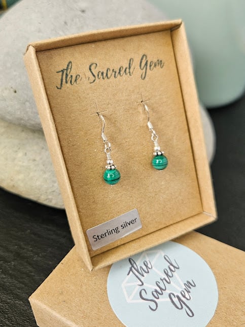 The earrings come carefully packaged in a kraft gift box which is made from 100% recycled card. Underneath the box insert, you will find a small poly bag for storage and an anti-tarnish strip to help keep the silver shiny. You will also receive a Sacred Gem gemstone card highlighting the meanings associated with malachite. On the reverse of the card are some simple jewellery-care guidelines.