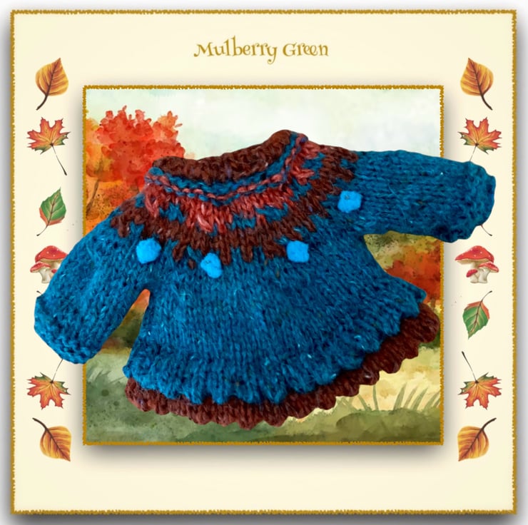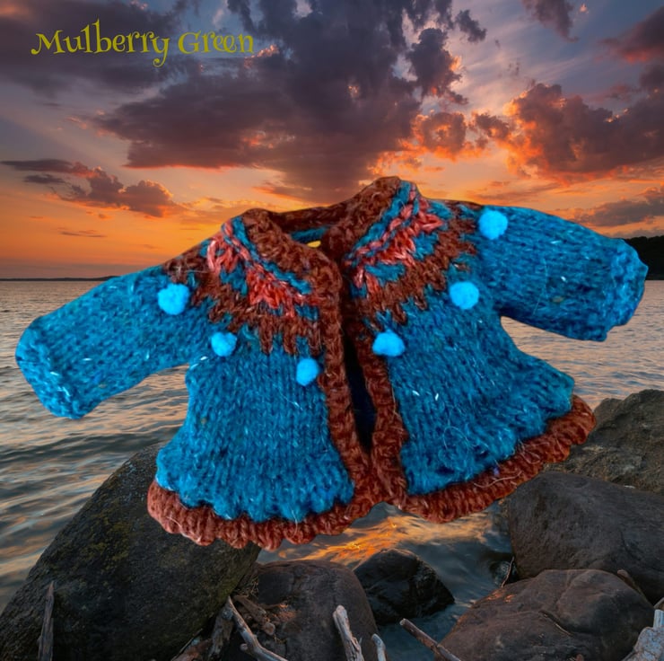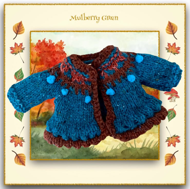 A gorgeous little teal and terracotta jacket in Rowan Felted Tweed, to fit the Mulberry Green characters. The jacket is hand knitted and has a patterned yoke decorated with tiny pom poms.