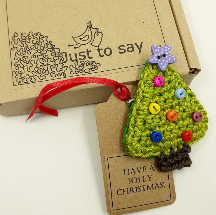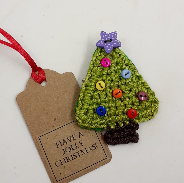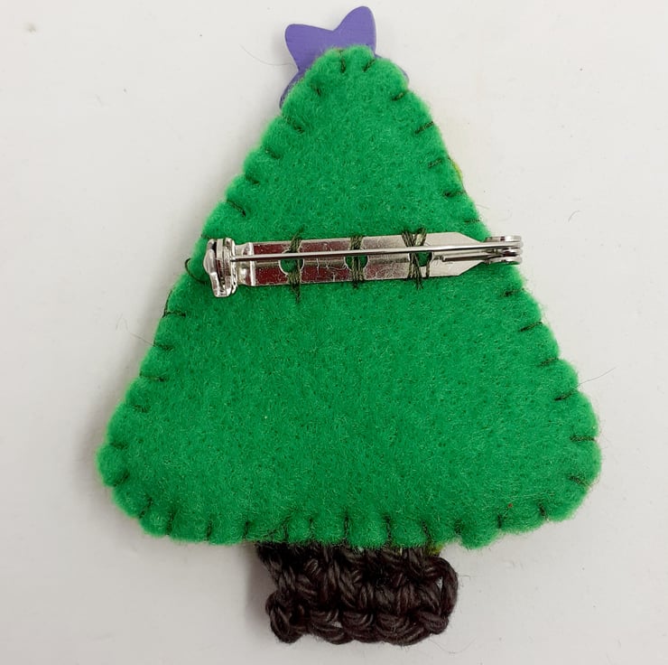 This cheerful, festive brooch is crocheted in cotton and backed with a layer of stiffened craft felt. The pin is firmly sewn in place. The tree is decorated with tiny acrylic buttons and a painted wooden star button. The Christmas tree measures approximately 7cm tall from the bottom of the trunk to the top of the star.