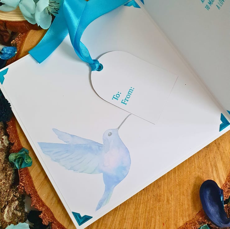 The arch shaped tag displays the same image, is stamped with "To: From:" at the back & holds a turquoise ribbon.