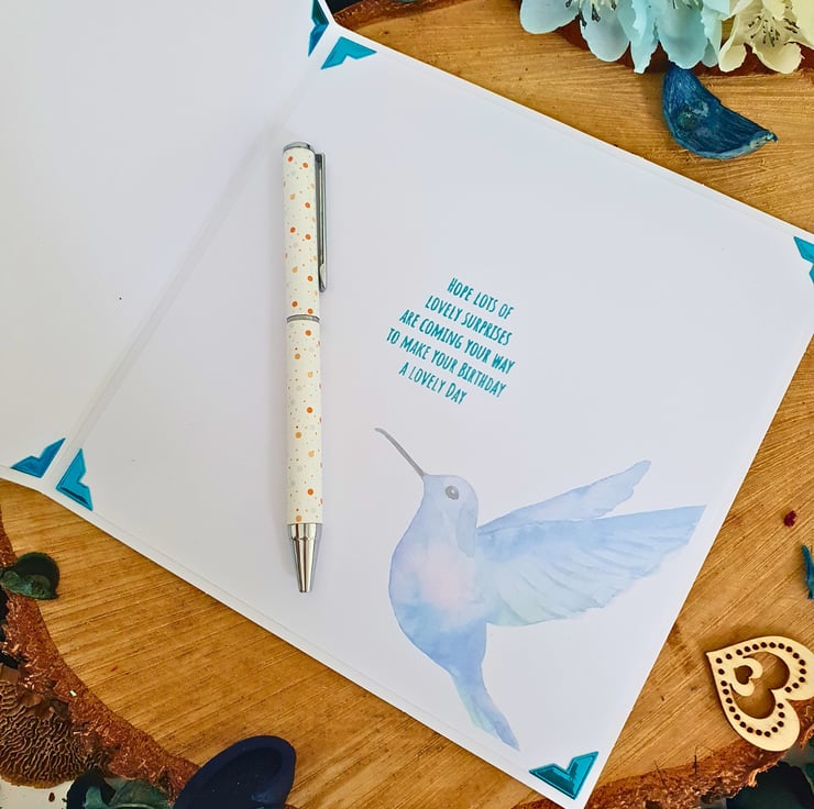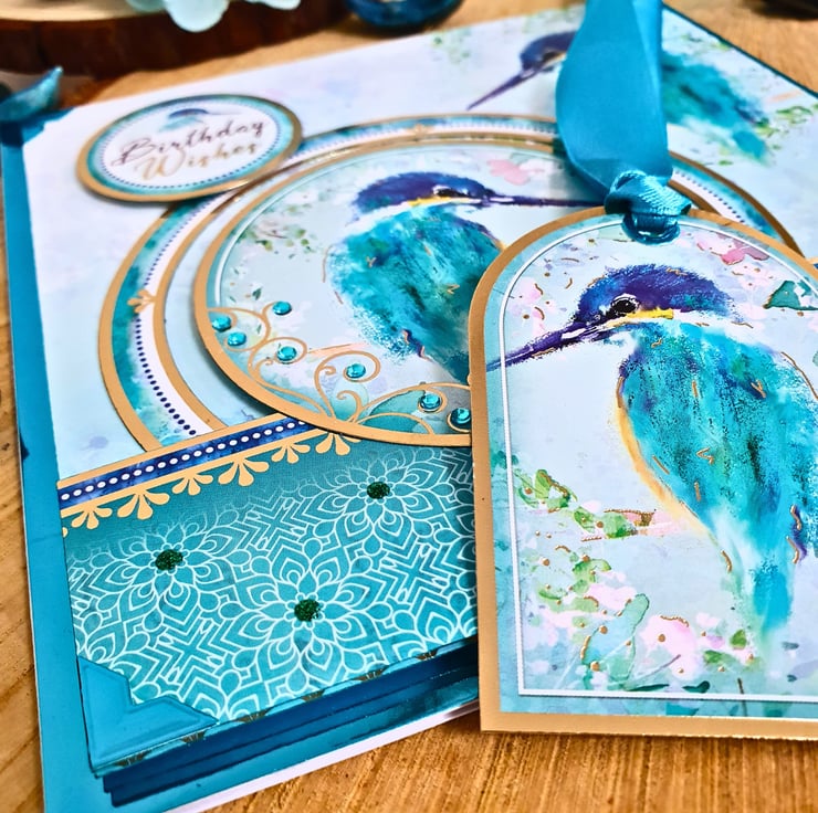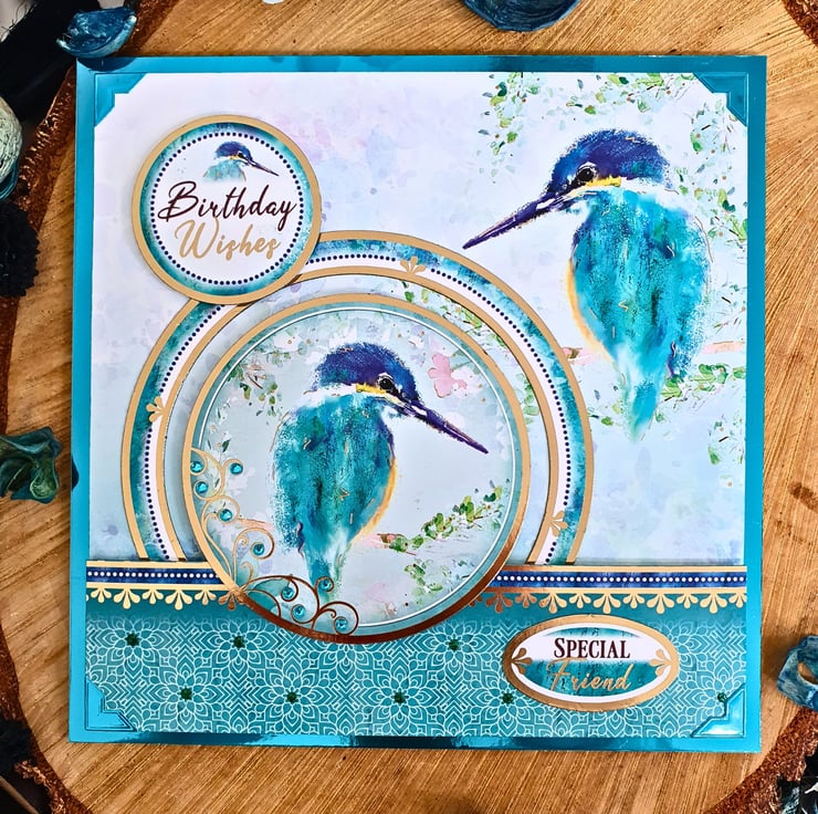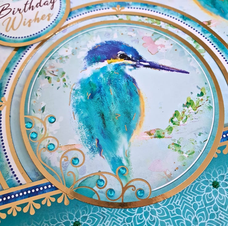 The card consists of mats & layers of turquoise mirror card & luxury cardstock printed with the image of a kingfisher bird. The large, gold foiled topper with the same image mirrored lays on the left, surrounded by a matching frame & raised for dimension. A decorative panel covers the bottom part of the card. "Birthday Wishes" & "Special Friend" are the sentiments on the outside of the card. It is embellished with dark green glitter accents & turquoise diamante. The card is finished with coordinating inserts, stamped with the verse "Hope Lots Of Lovely Surprises Are Coming Your Way To Make Your Birthday A Lovely Day". Decorative photo corners give a unique, elegant finish to the card.