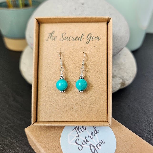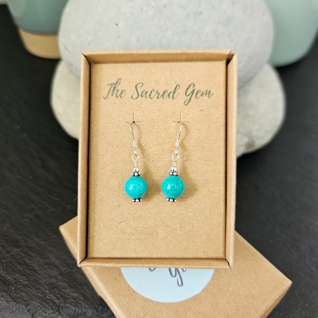 The earrings come carefully packaged in a kraft gift box which is made from 100% recycled card. Underneath the box insert, you will find a small poly bag for storage and an anti-tarnish strip to help keep the silver shiny. You will also receive a Sacred Gem gemstone card highlighting the meanings associated with turquoise. On the reverse of the card are some simple jewellery-care guidelines.