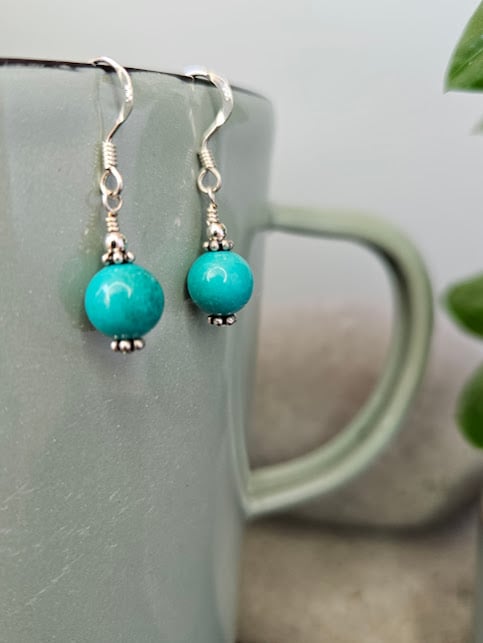 These pretty earrings are made with 8mm round stablised turquoise beads from the Hubei Province in China. They are complimented with sterling silver Bali flower-shaped spacers, beads and ear hooks.