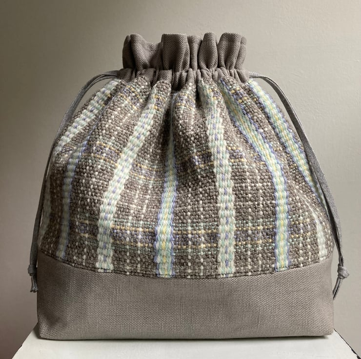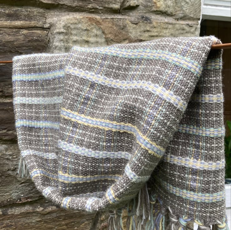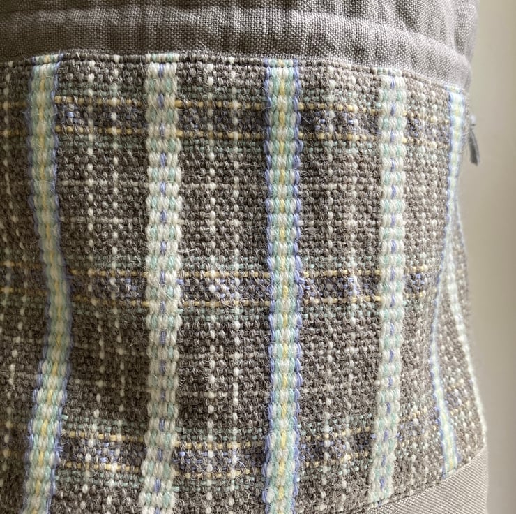 Handwoven wool fabric in pastel shades of blue, green & yellow along with natural shades of grey and ecru wool - all British wool.