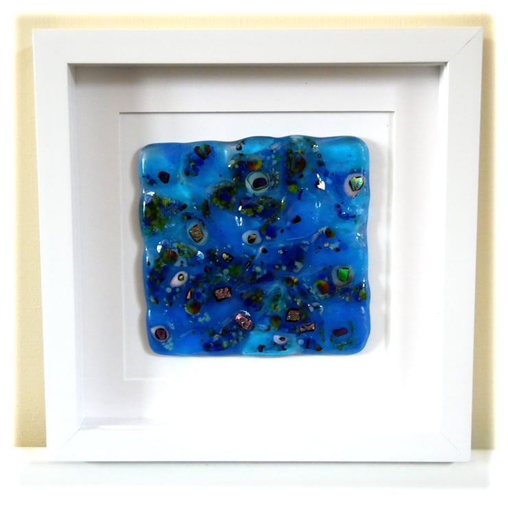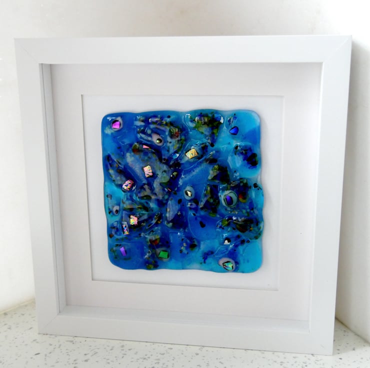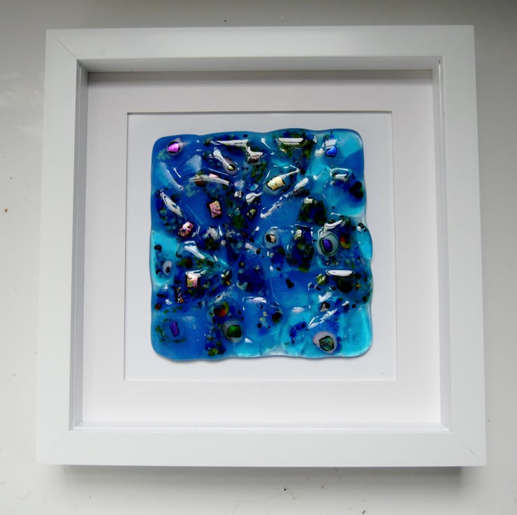 The fused picture measures 12cm square and is fitted at the back of a box frame with a 19cm aperture, 22.5cm square frame.
