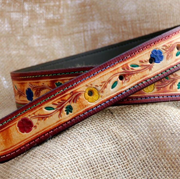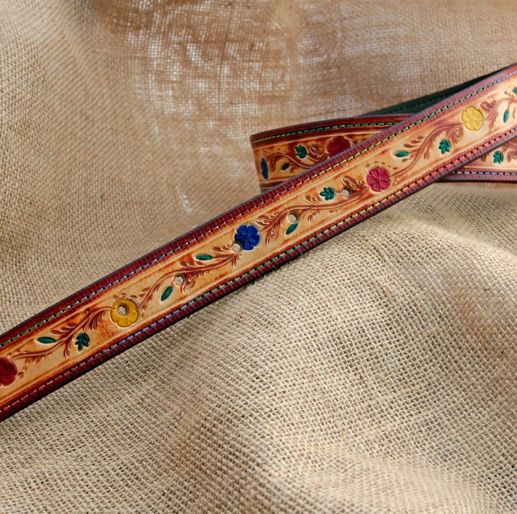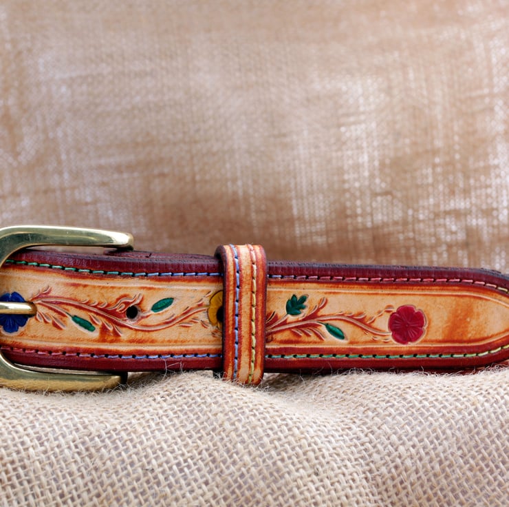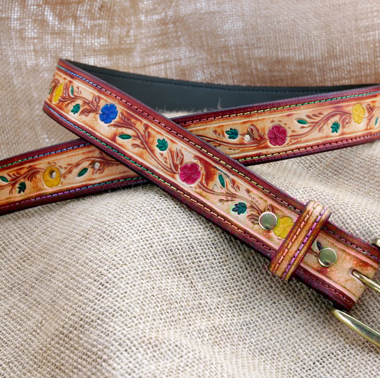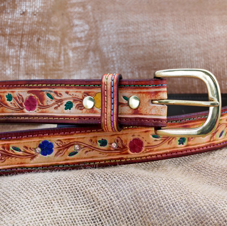 Handmade leather belt with colourful floral design. This belt has been made from high quality vegetable tanned leather, hand tooled with a floral design and hand dyed for a unique one of a kind appearance. It has been fitted with a solid brass buckle and a matching rainbow stitched leather keeper.