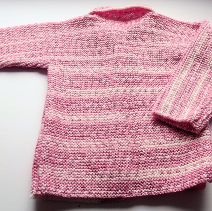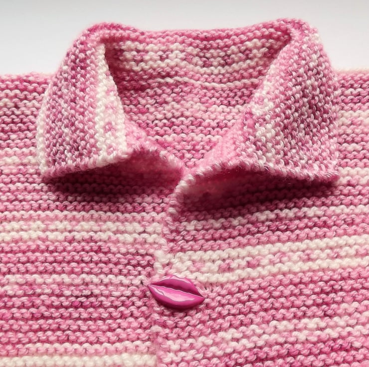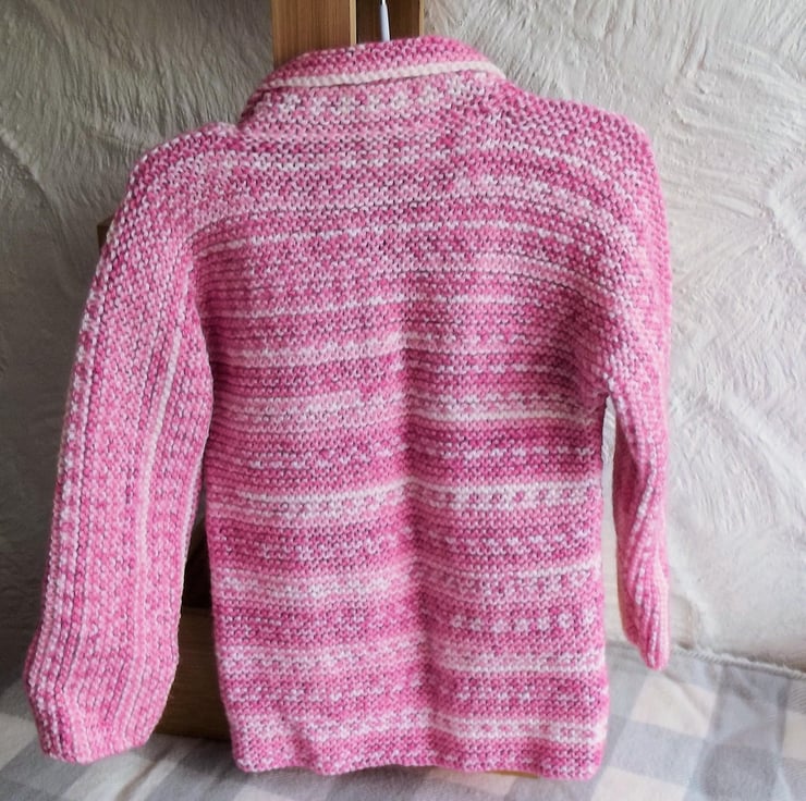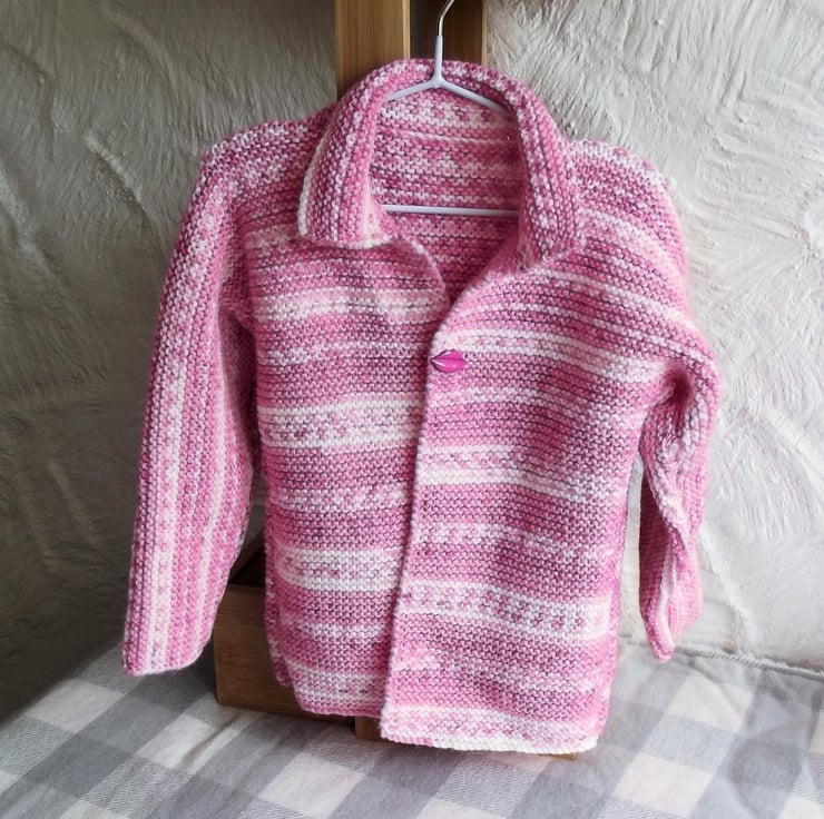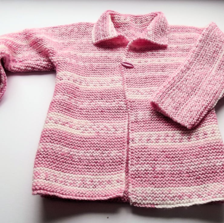 Hand knitted by me. Pink and White Babies Cardigan Jacket. Collared neck and 1 lips button closure. Knitted in medium weight acrylic blend yarn. hm5.