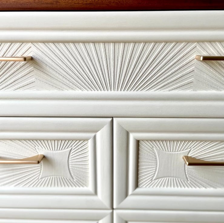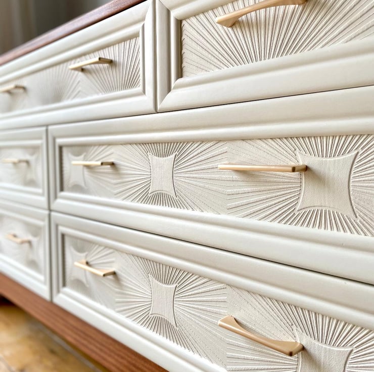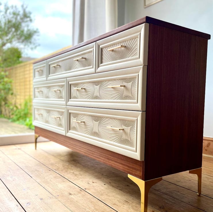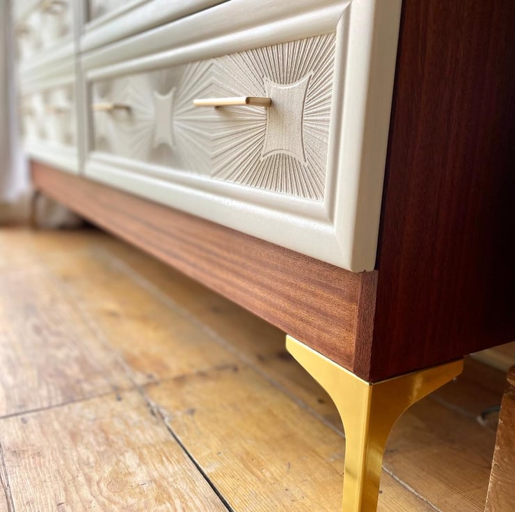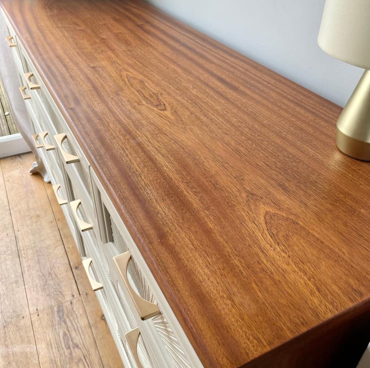 The Chest of Drawers Main Frame has been sanded back to it's rich Mahogany wood and finished with Organic Beeswax. The Drawer Fronts with a Newly Applied Textured Finish are Hand Painted in a Soft White/Cream eggshell that exudes elegance and reflex the light beautifully. Elevated on four gold legs, it not only provides ample storage but also adds a touch of Contemporary flair with extra height.