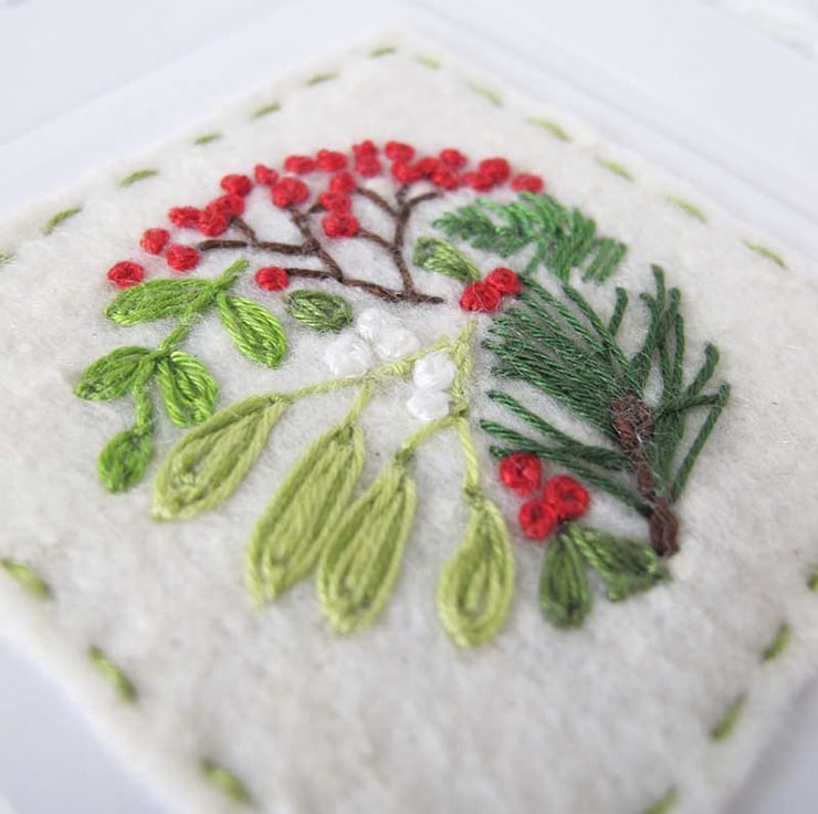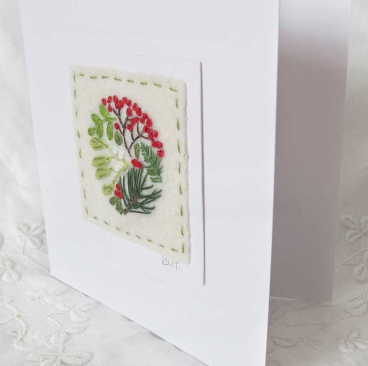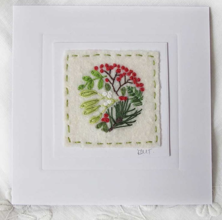 This beautiful card has been embroidered by hand onto a soft wintery fleece fabric. The design is a circlular shape filled in with embroidered foliage including Mistletoe, pine needles, leaves and red berries - a perfect card for a special person, or perhaps framing it as it is. It has been mounted on a card base and is surrounded by an embossed square. The card has been left blank for your own message.