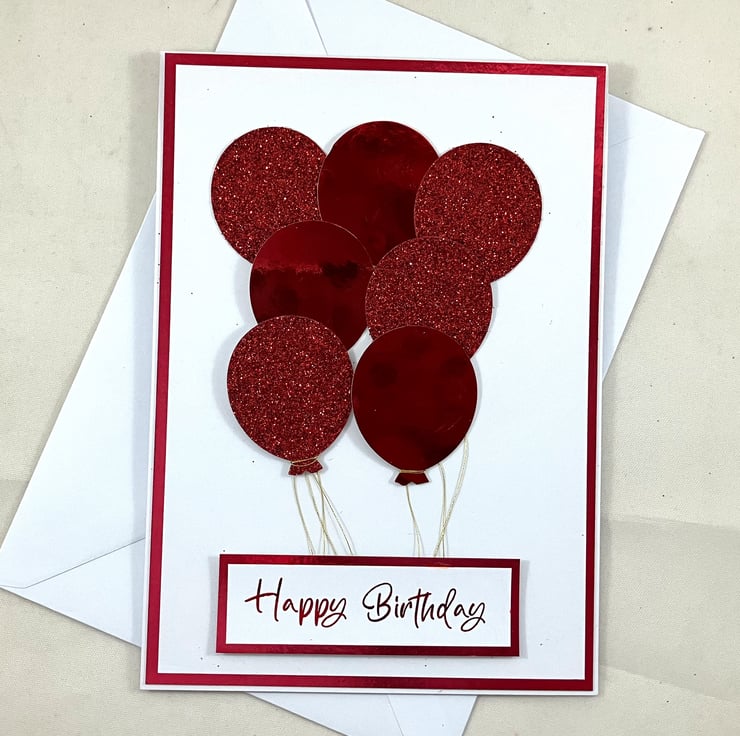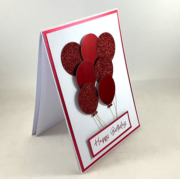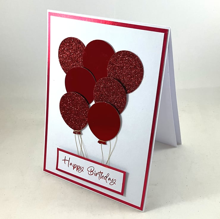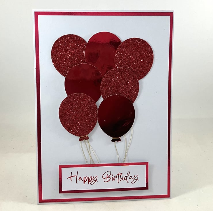 A6 birthday card in a tent folded style with a matching gift tag. The card features a number of balloons punched from red glitter and red mirri card, with gold thread tied to the bottom of each balloon. The heat foiled sentiment reads: 'Happy Birthday'. Both are on white card overlaid onto red mirri card. The insert has been left blank for your own message.