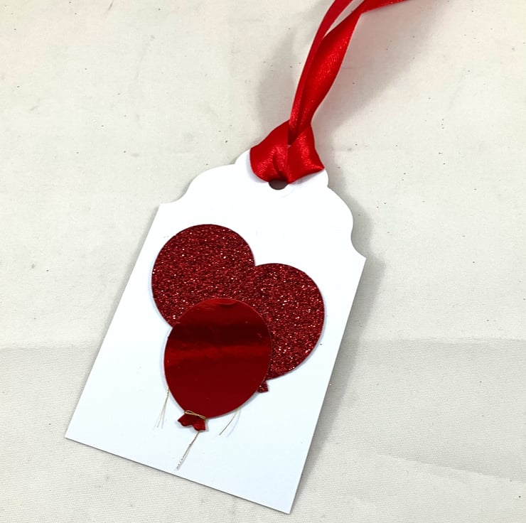 The tag has three balloons on a white background with red satin ribbon to attach to your gift. The reverse is blank for your message.