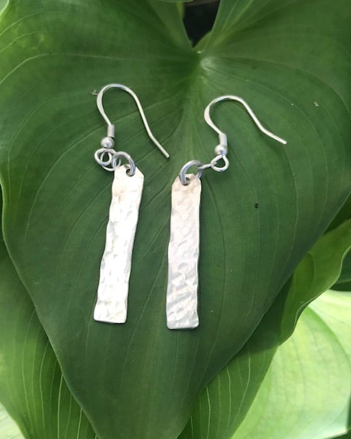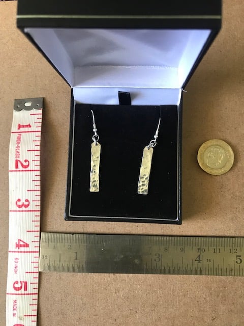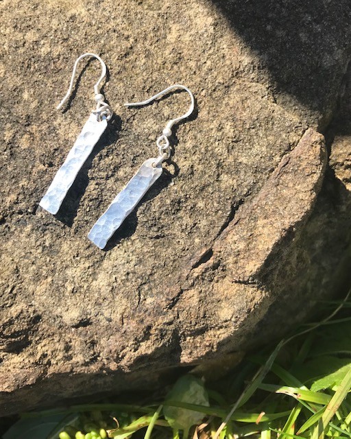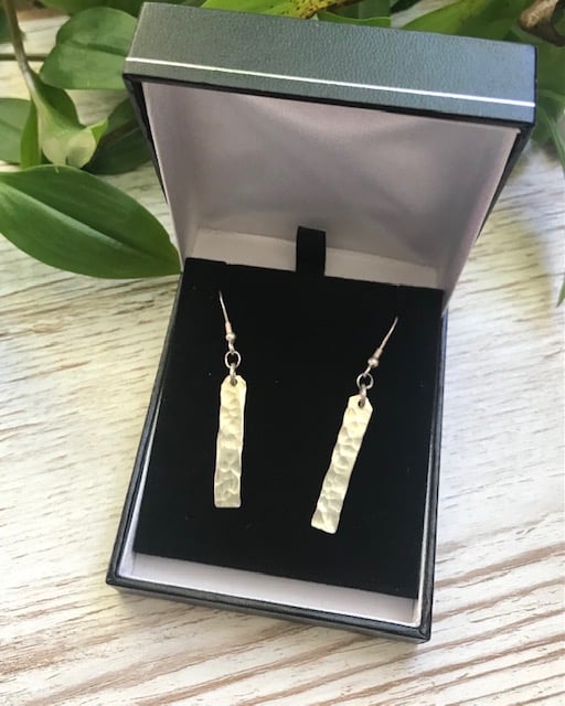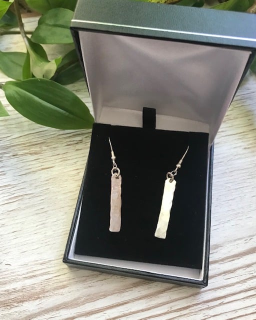 These are two lovely long danglers! I made this pair of earrings from recycled Sterling Silver 925 and they have a hammered surface. The silver bars hang from earring hooks and they move and turn so they catch the light.