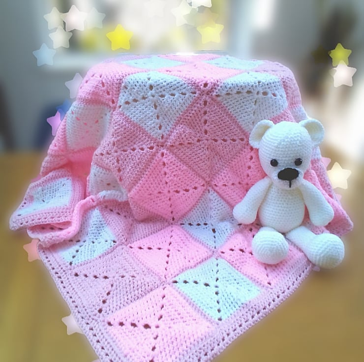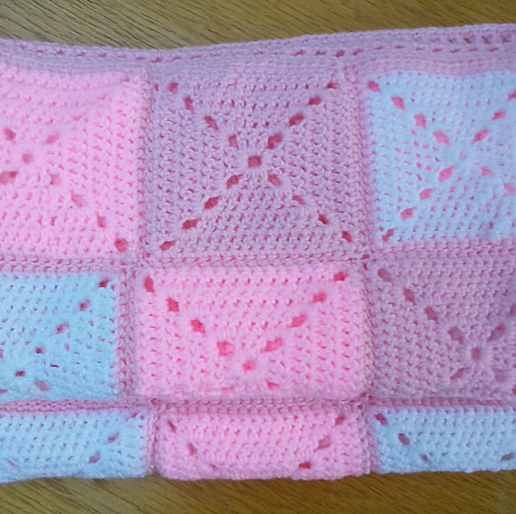 Crocheted baby blanket handmade with Granny squares in shades of pink. Made in a non smoking home.