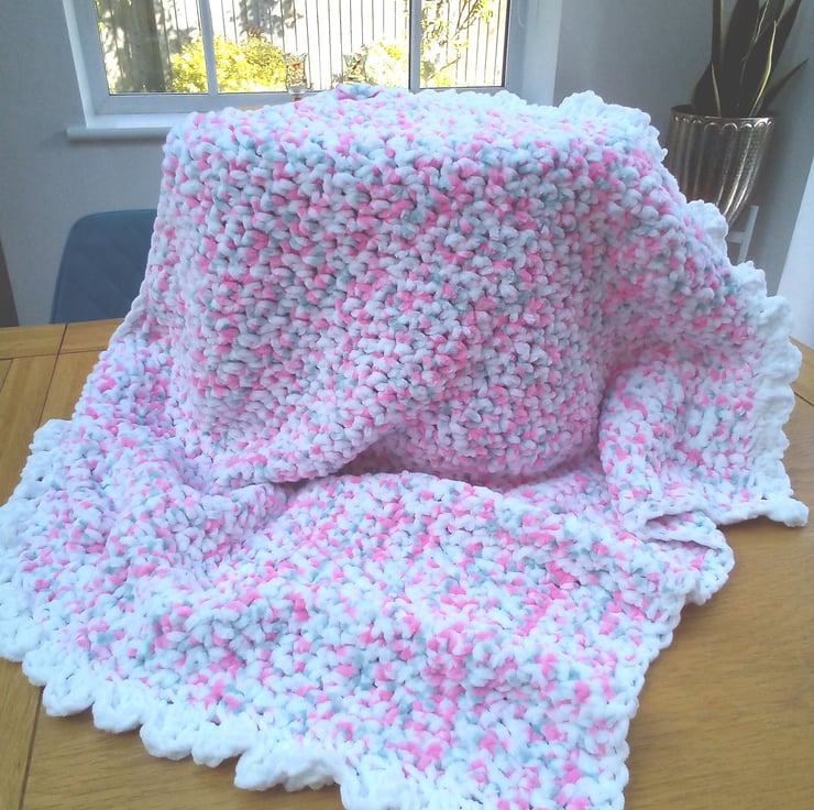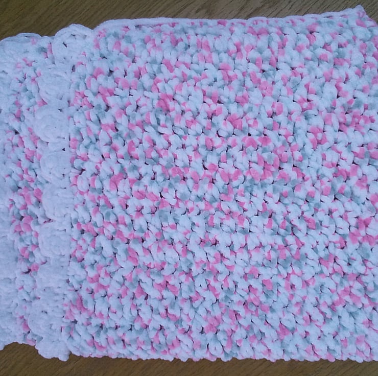 Soft and snuggly, pink, grey and white baby blanket made with chenille yarn. Finished off with a white scalloped edging.