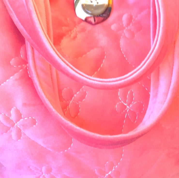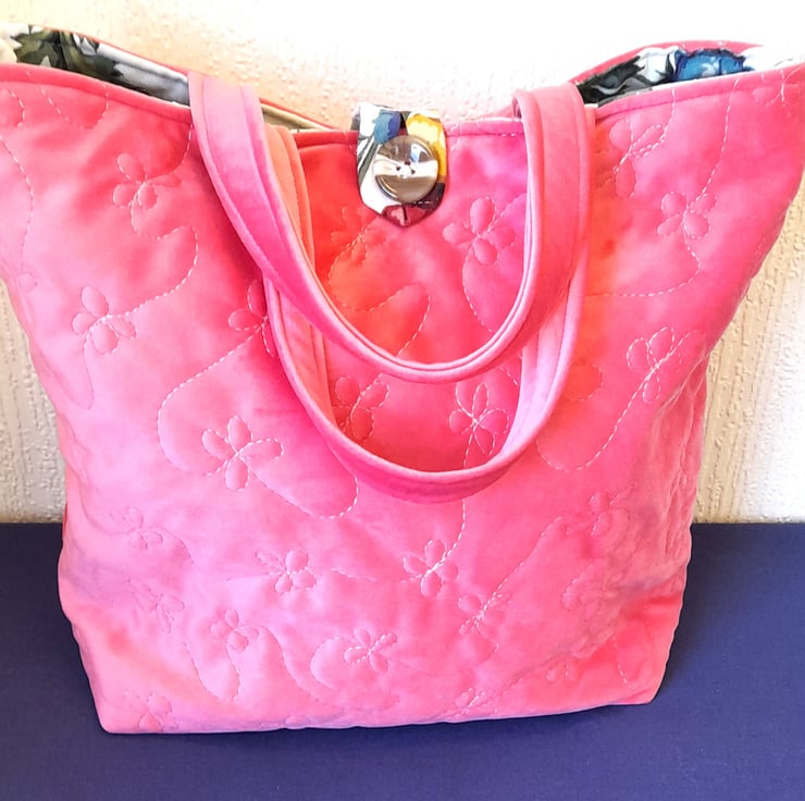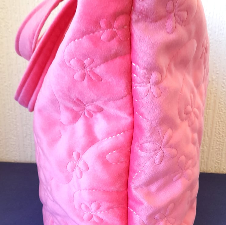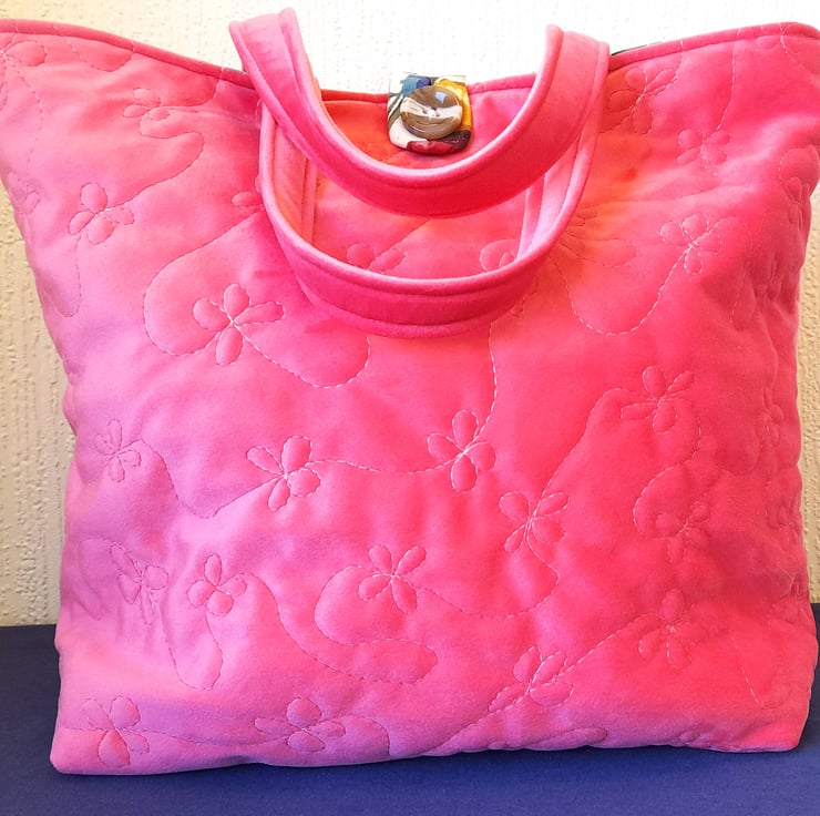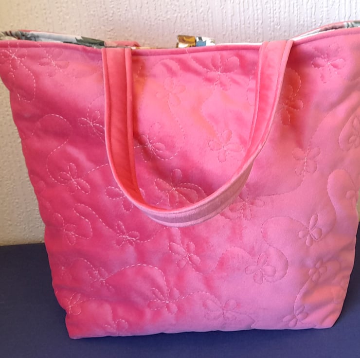 This bag has been made from soft, coral pink brushed fabric. It has been free motion quilted in a trailing floral design, which adds texture and gives it a luxury feel. The handles are constructed from the same pink fabric.