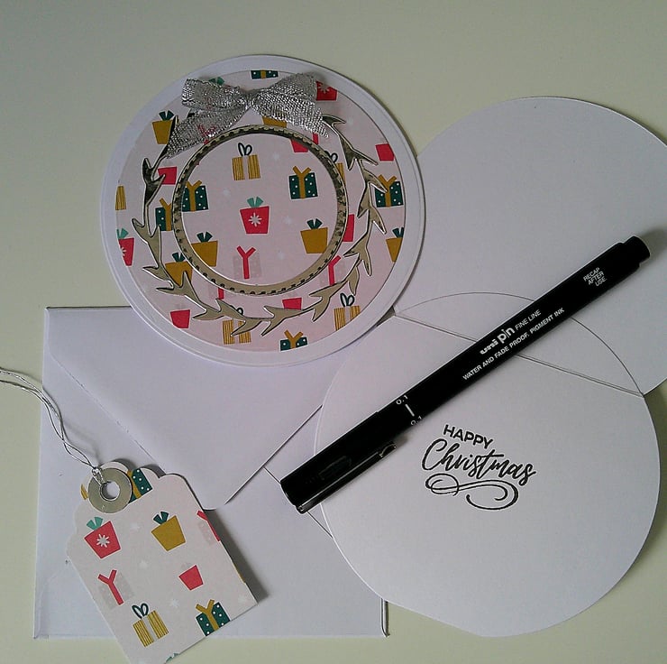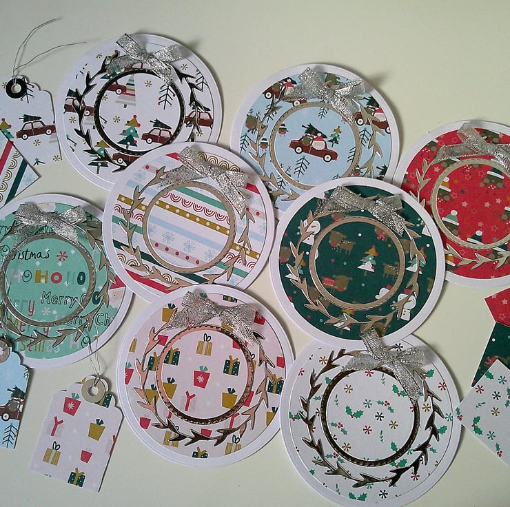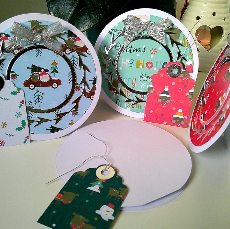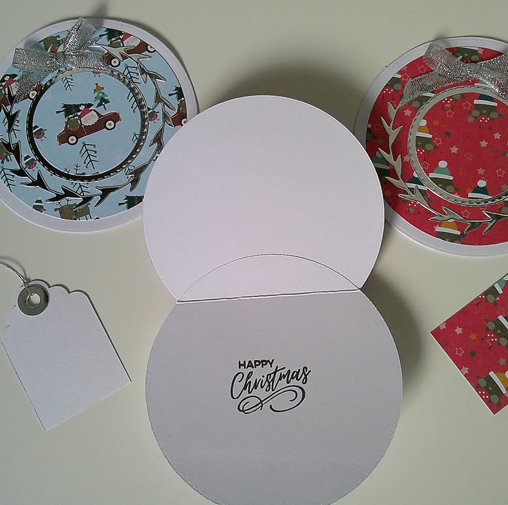 A great set of compact cards to have on hand. Each card is approx 4.5 inches / 11.5cm in diameter, supplied with a plain white handmade envelope and a matching gift tag. The inside of each card has been stamped with a 'Happy Christmas' sentiment.