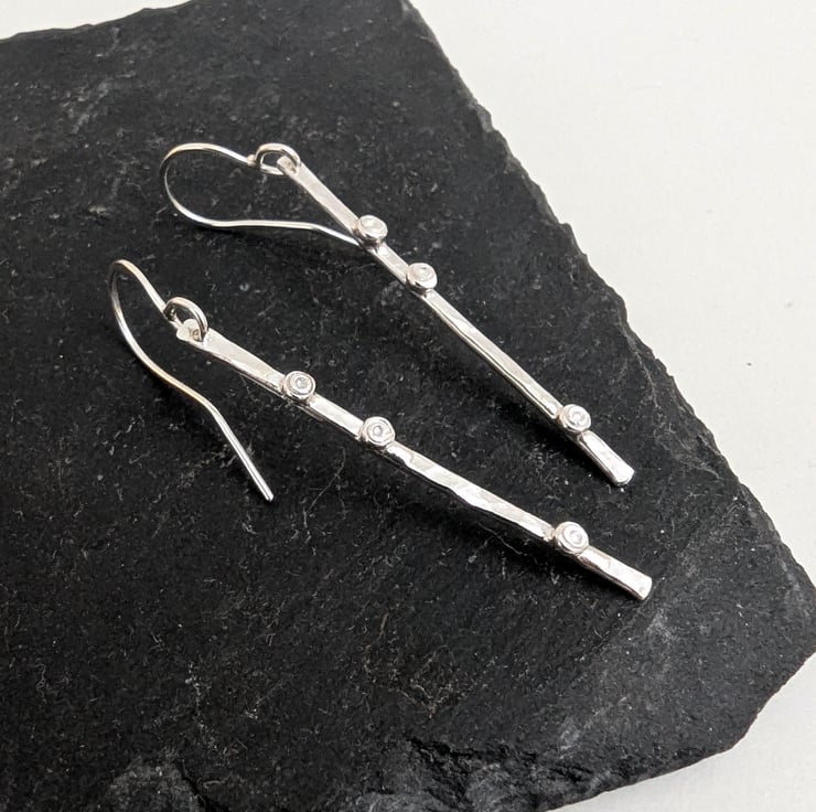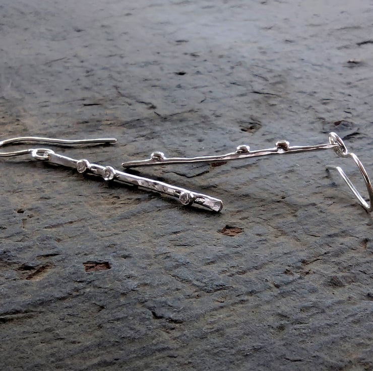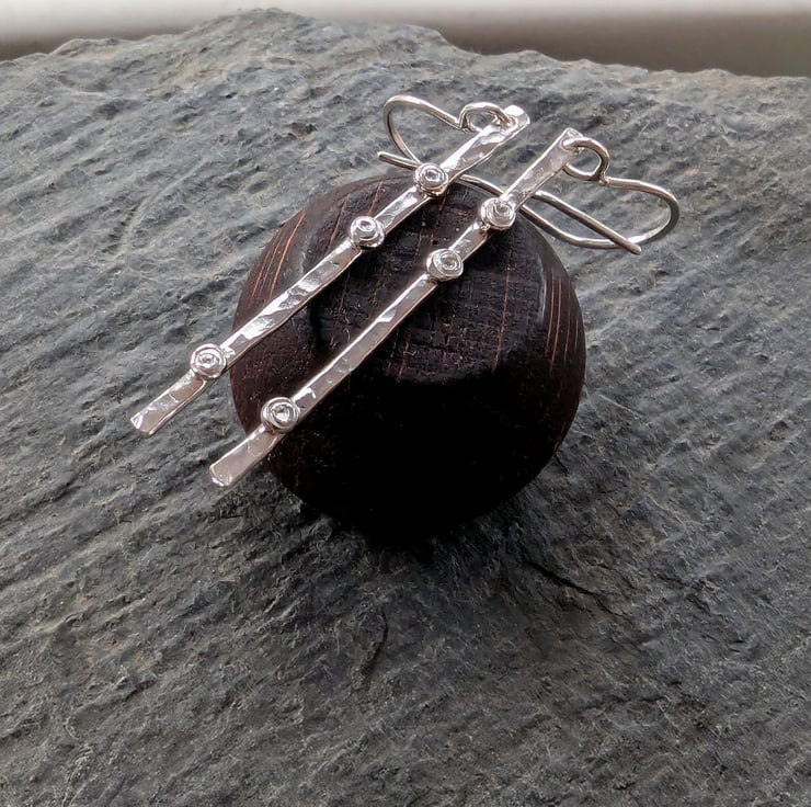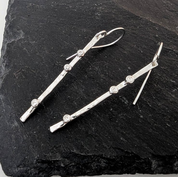 Long drops earrings 35 mm with 3 rivet designs hammered with handmade hooks