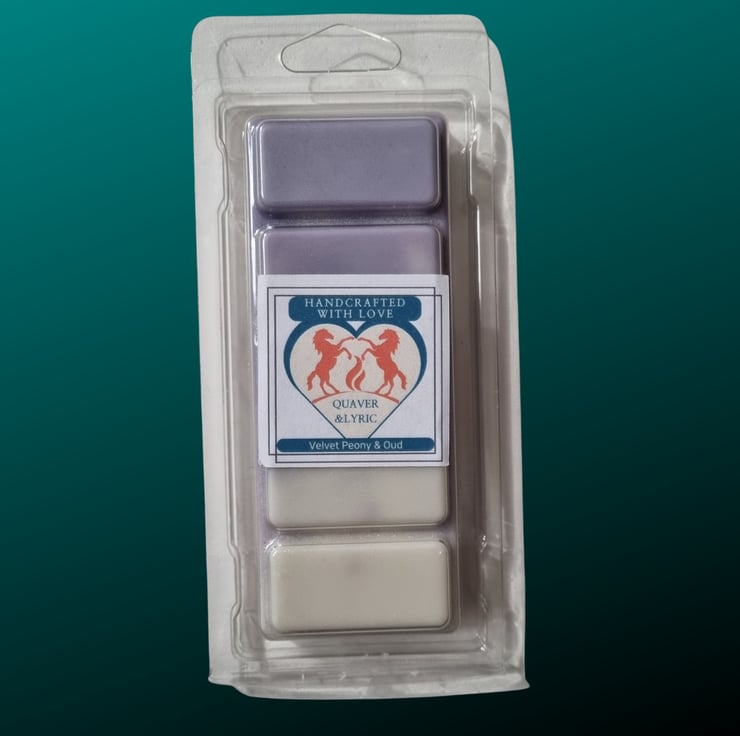 Luxurury highly scented velvet peony and oud fragranced soy wax melt bars. Lilac and white scented wax, hand poured into clamshells to produce a two tone melt bar. Made with premium quality, responsibly sourced soy wax and the finest fragrances providing 65 hours of long-lasting home scent.