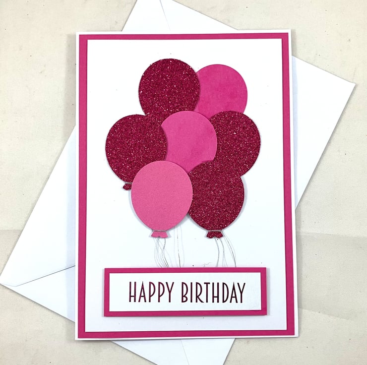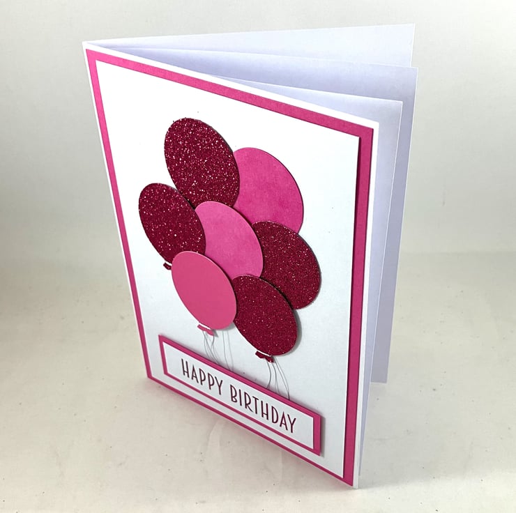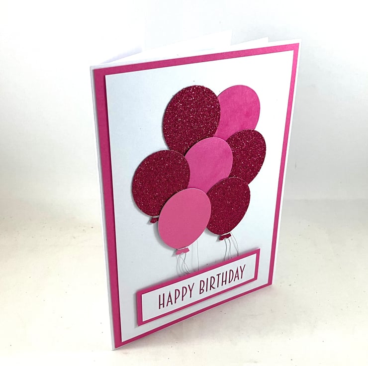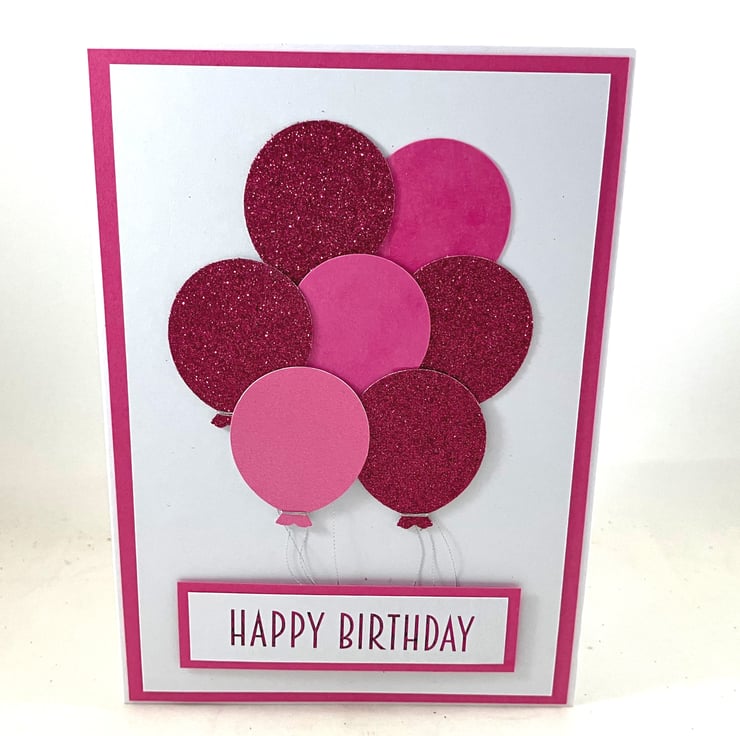 A6 birthday balloons card with a matching gift tag. The card features a number of balloons punched from pink pearlescent card and pink glittered card, with fine silver thread tied to the bottom of each balloon. The heat foiled sentiment reads: 'Happy Birthday'. Both are on white card overlaid onto bright pink card. The insert has been left blank for your own message.