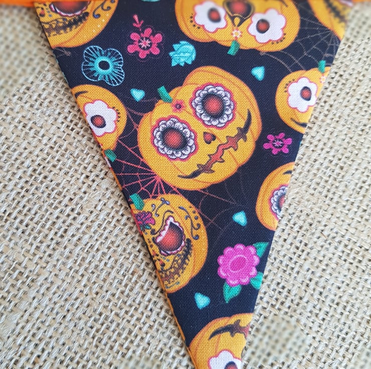 The bunting is approx 1.5m long with u penants each measuring approx 18cm x 13 cm. The webbing is cotton and may be black or orange.. The cotton I have chosen is s good quality cotton.