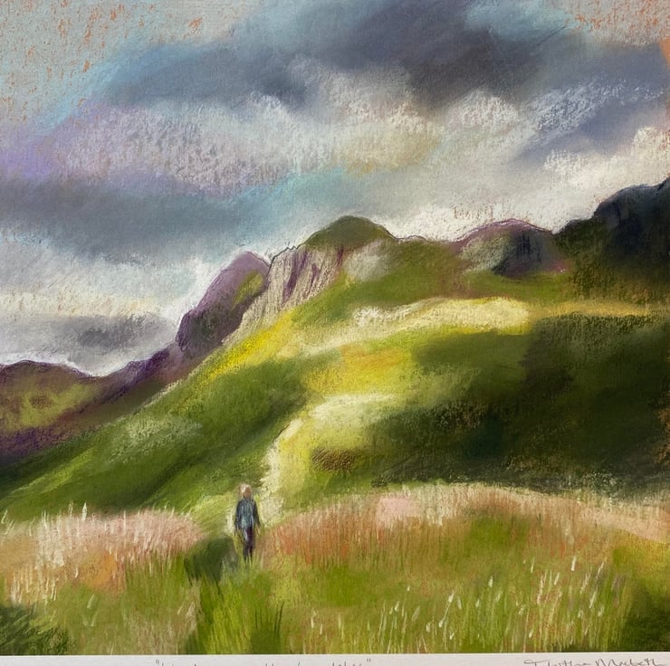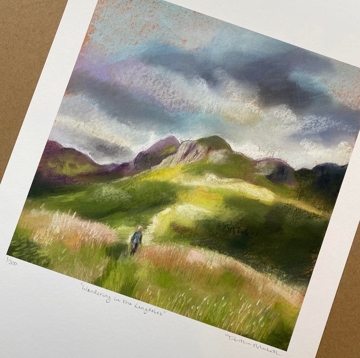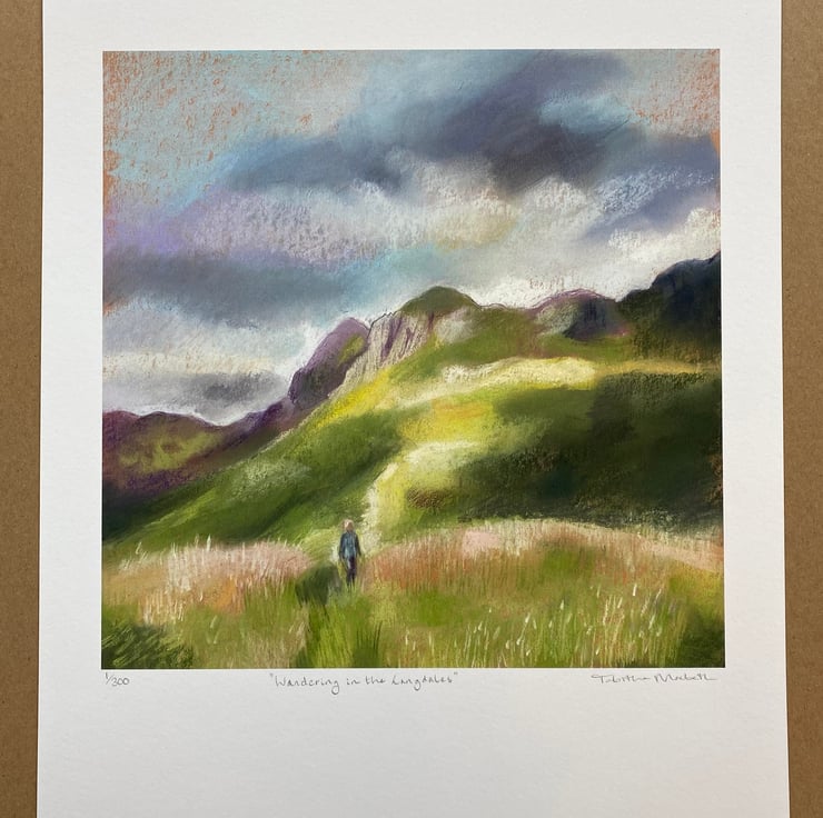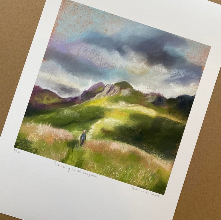 The Langdales is a stunning area of the Lake District (within Cumbria - near Ambleside) in the UK. In this piece, I aimed to capture the ever changing light, and to evoke both the atmosphere and the expansive feeling of walking and being there. It is an artist self portrait as well, as that is me wandering in the hills!