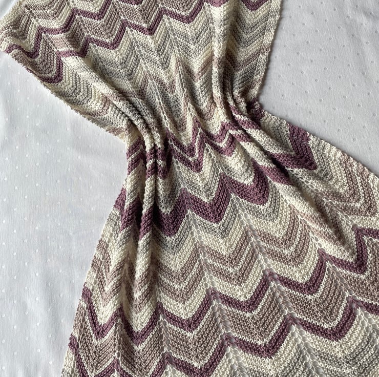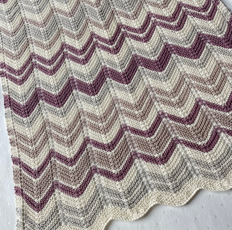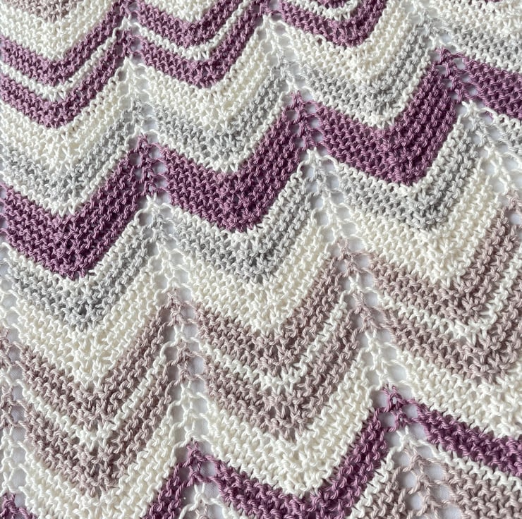 Pretty chevron striped baby blanket in cream, grey, and shades of lilac.