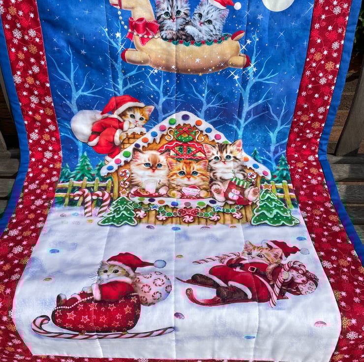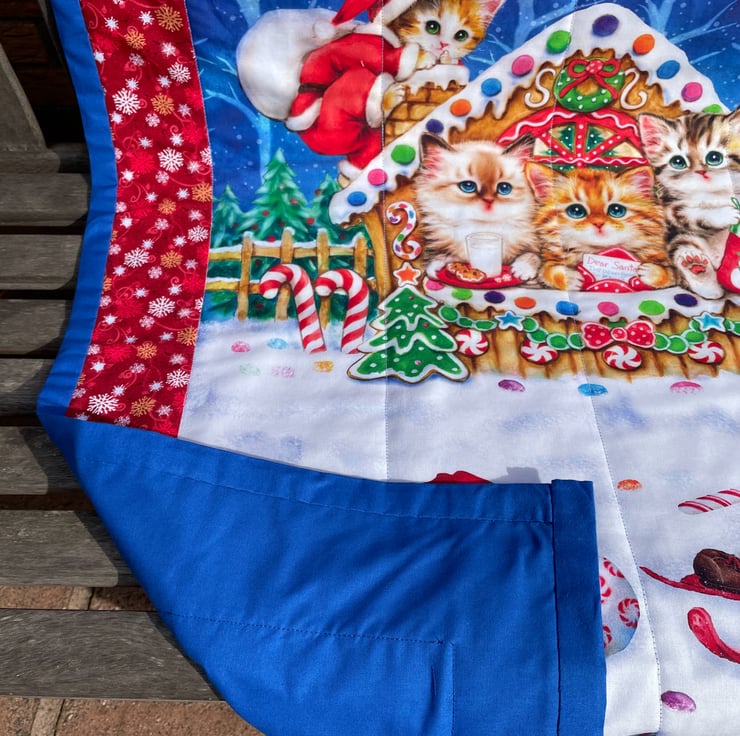 A beautiful handmade quilt or throw with lovely images of kittens playing in the snow. Reverse fabric and binding is royal blue cotton fabric. Wadding is luxurious cotton bamboo blend. Approximately 48 x 30 ins making it the perfect size for a lap quilt. Would be perfect gift for Christmas.