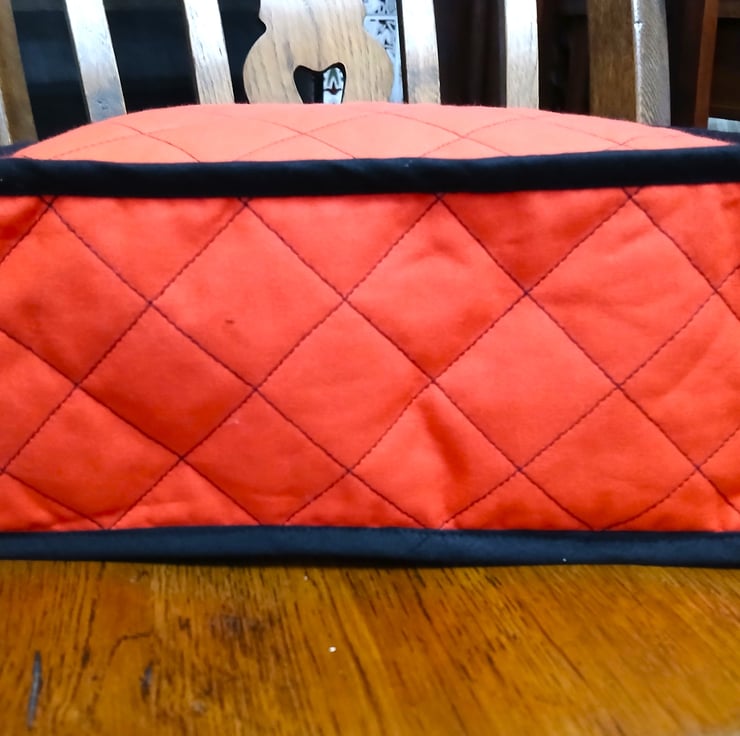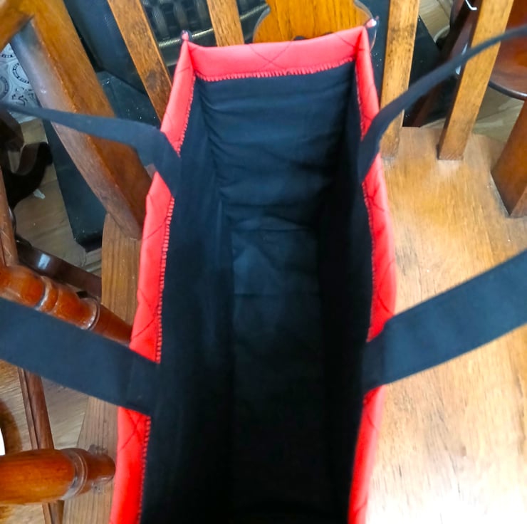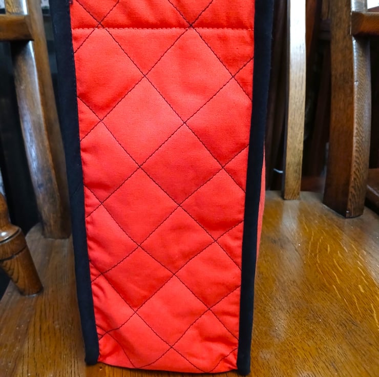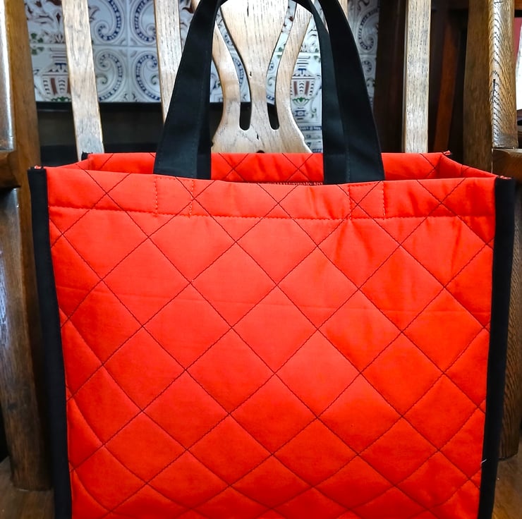 Bags, Small Shopper in Orange and Black Cotton fabric. This bag is interfaced to give it structure and is lightweight. It has cross hatch stitching in black to compliment the lining to give that quilting effect . The inside is lined with black cotton fabric and has Black Cotton straps.