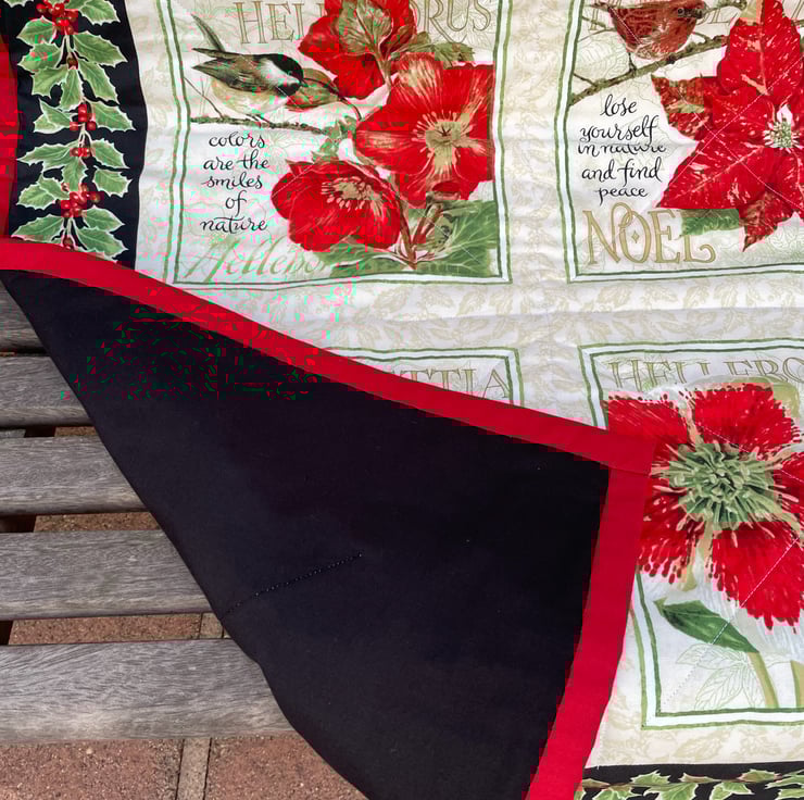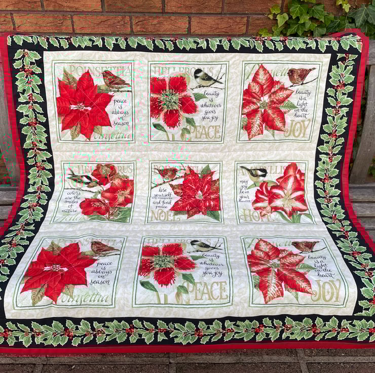 A beautiful handmade quilt or throw with lovely images of poinsettias, birds and quotations. Edged with holly border. Reverse fabric is black and binding is red cotton loop fabric. Wadding is luxurious cotton bamboo blend. Approximately 44 x 41 ins making it the perfect size for a lap quilt. Would be perfect gift for Christmas.
