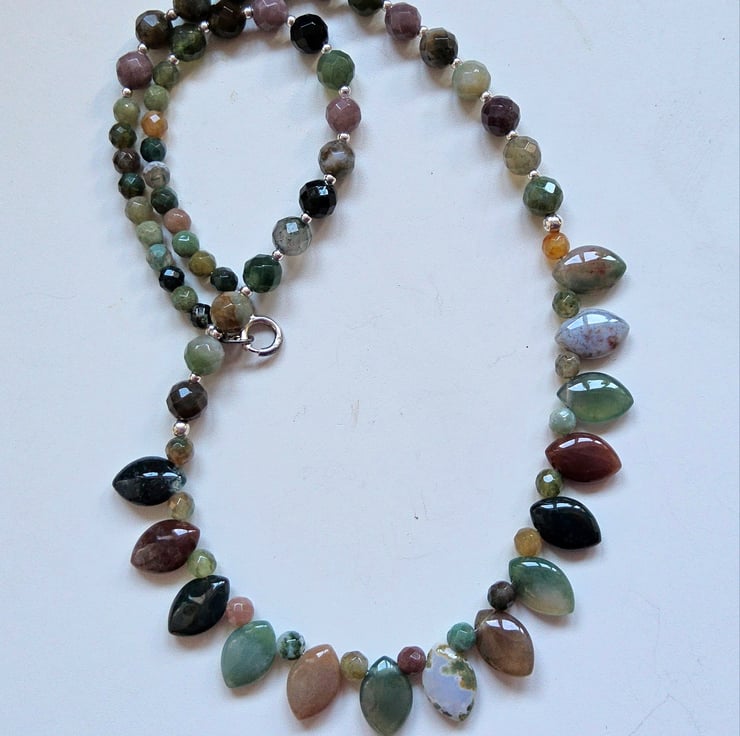 A feminine affordable pretty necklace designed and hand crafted in Cornwall using top centre drilled 11mm by 6mm genuine fancy jasper drops and 5mm faceted round fancy jasper gemstones. Within the design are 2mm sterling silver spacer beads to add an opulent feminine finish to the item.