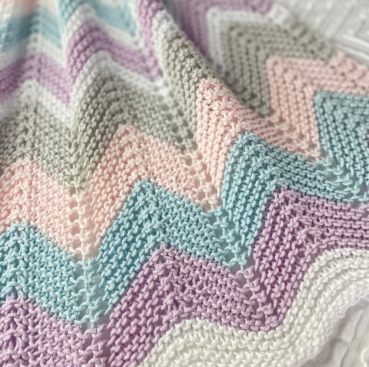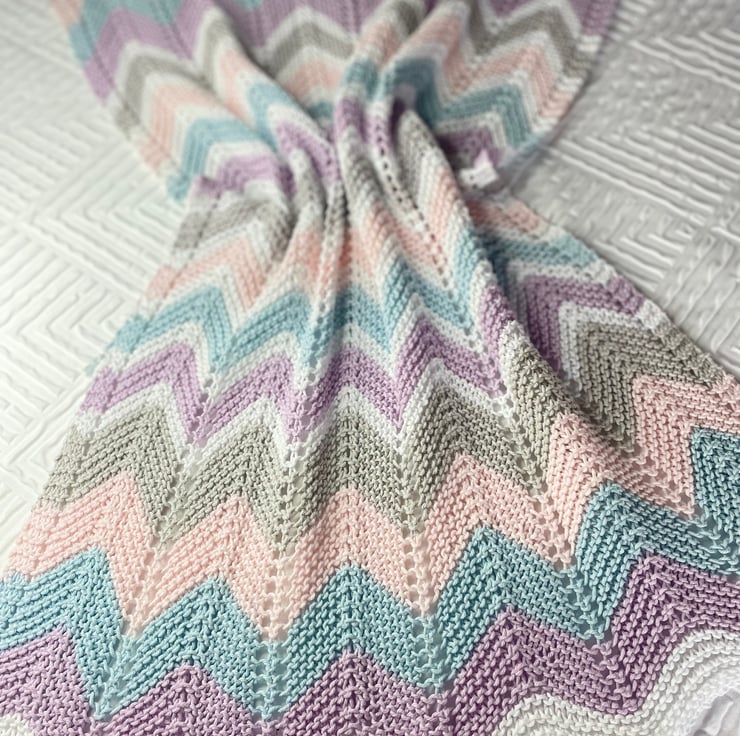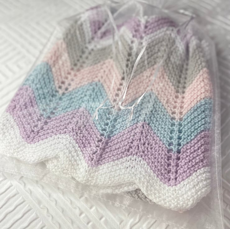 Pretty little chevron striped baby blanket in beautiful pastel shades. This one is pale pink, lilac, pale blue, grey and white and measures 55cm x 75cm
