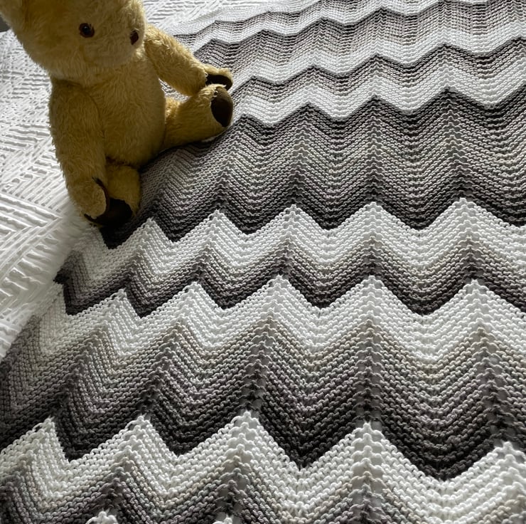 Generously sized, chevron striped baby blanket in beautiful neutral shades. This one is shades of grey complemented by crisp white, and measures 65cm x 75cm