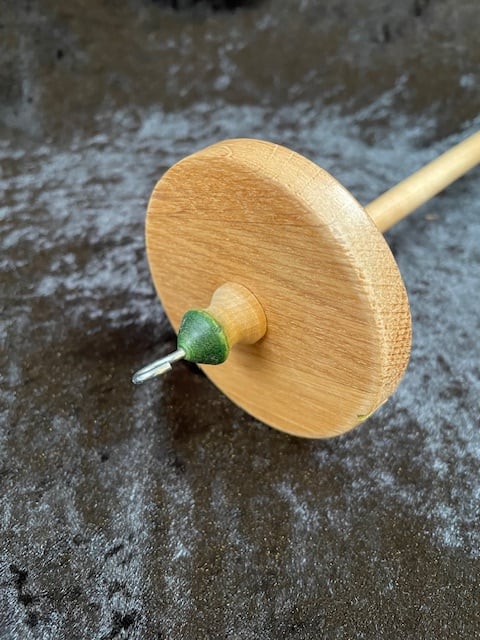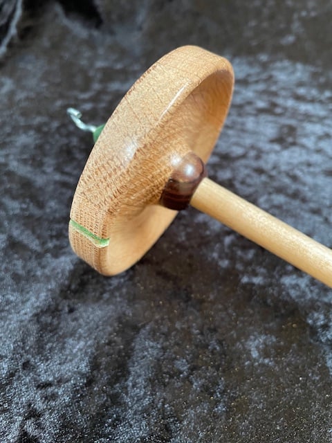A nicely weighted drop spindle with weight concentrated in the rim. It's crafted from mixed hardwoods with a touch of wood stain highlight. 38 grams x 28 cm long and 7.5 cm dia