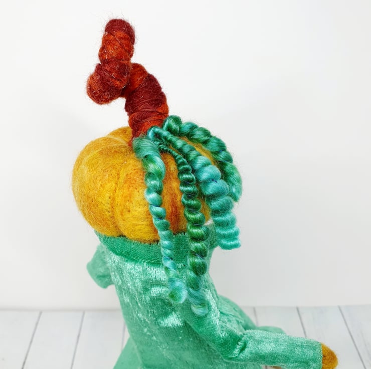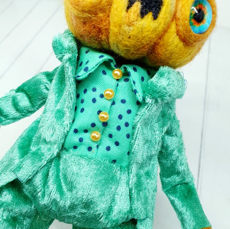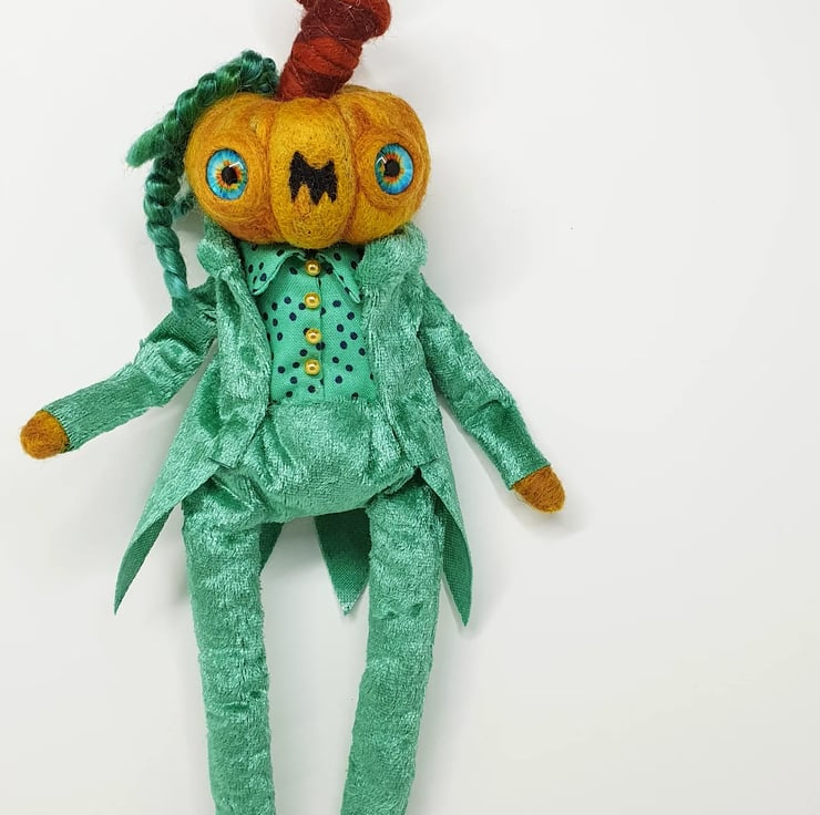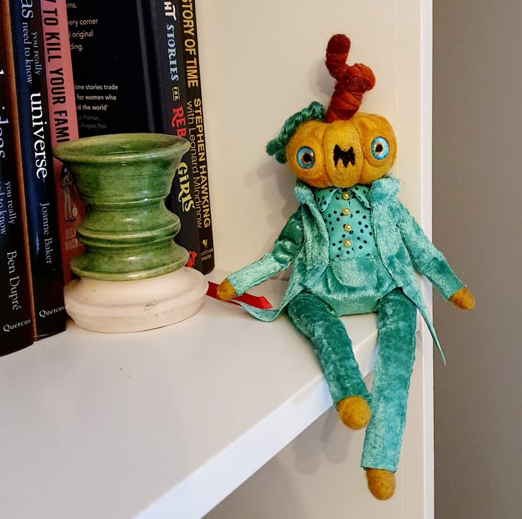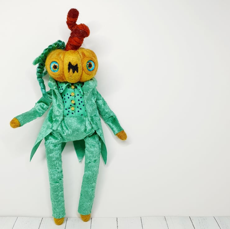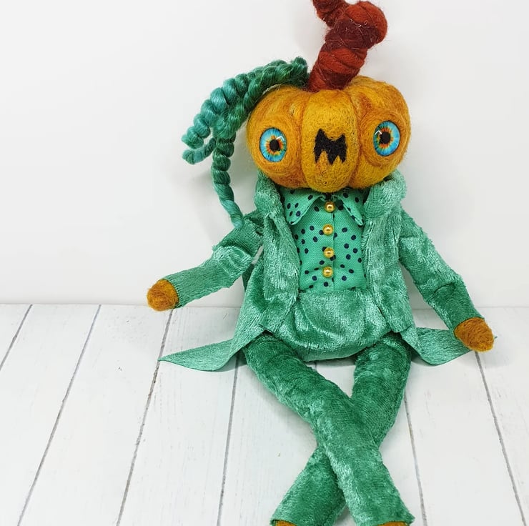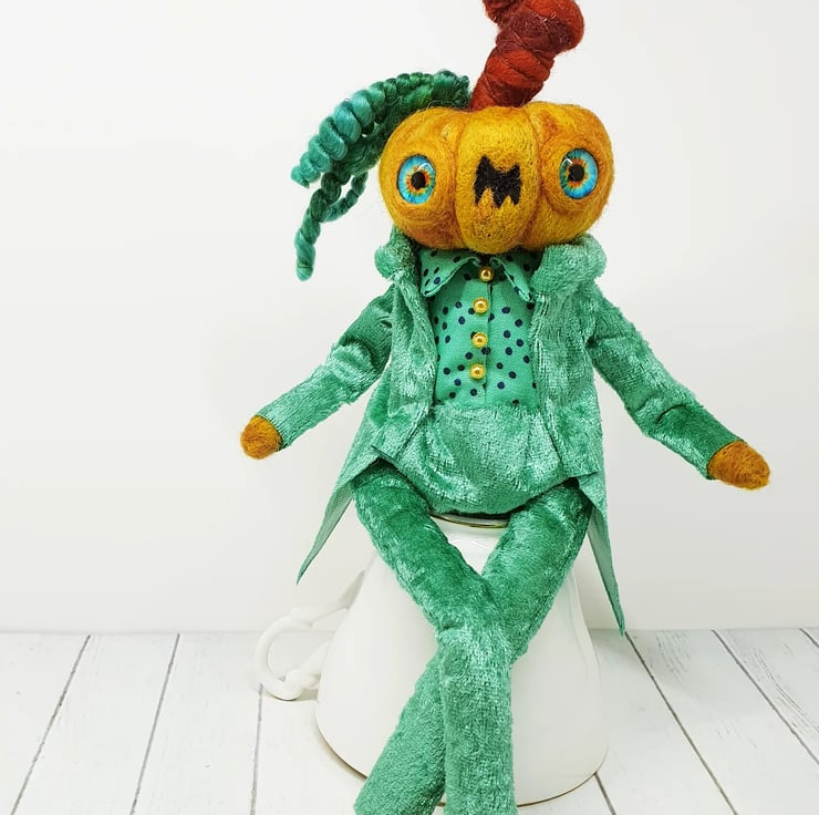 The needlefelted wool pumpkin has glass eyes and is made with various shades of complimentary colours. This doll has a wired core and so can be made to pose and sit. Pumpkin wears velvet suit with cotton speckled shirt that has yellow bead buttons. Suit and shirt are sewn into place. Pumpkin has hand dyed yarn foliage and twisty stalk with thread wrap. This is for decorative purposes only, handmade and delicate, with care it should last for many spooky seasons to come. Pumpkin measures roughly 26cm tall. This is not a toy.