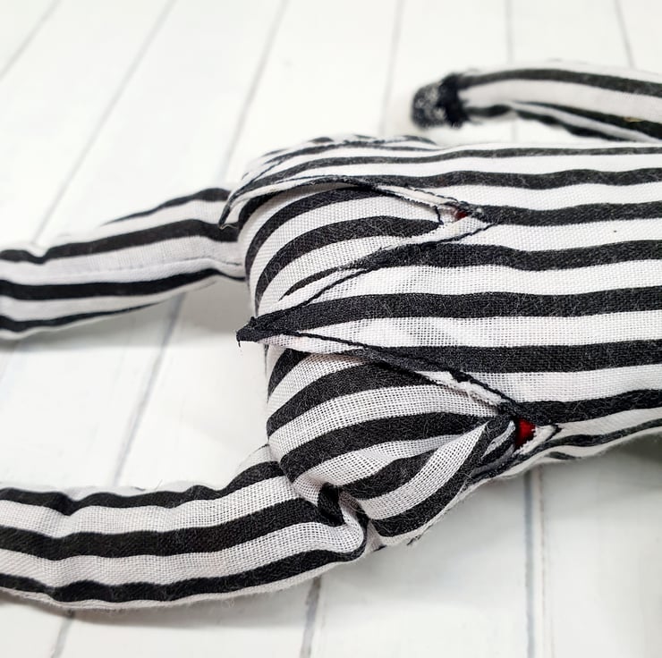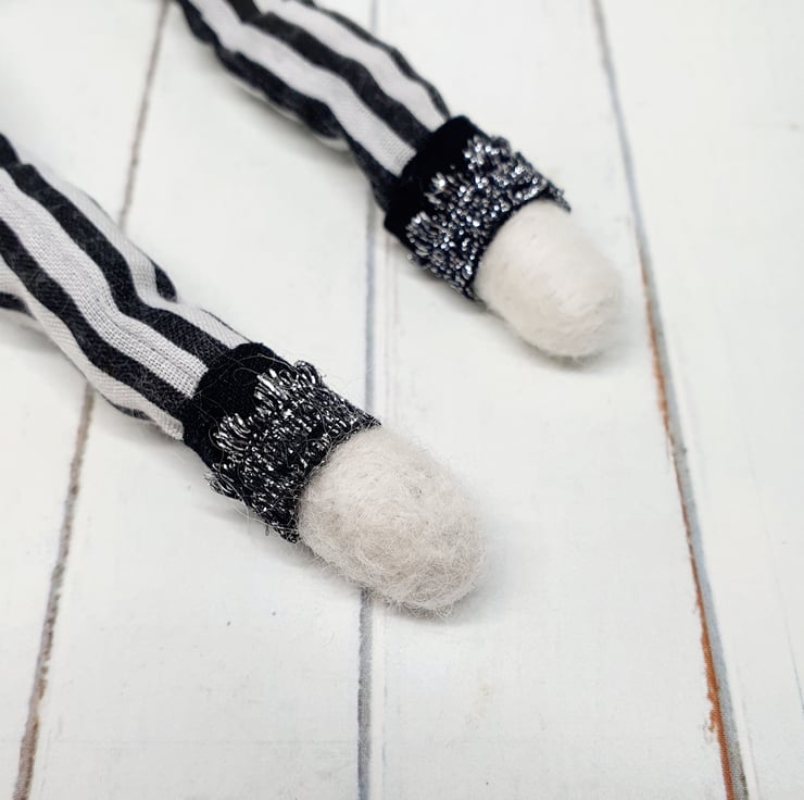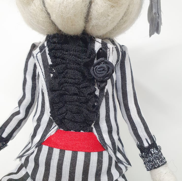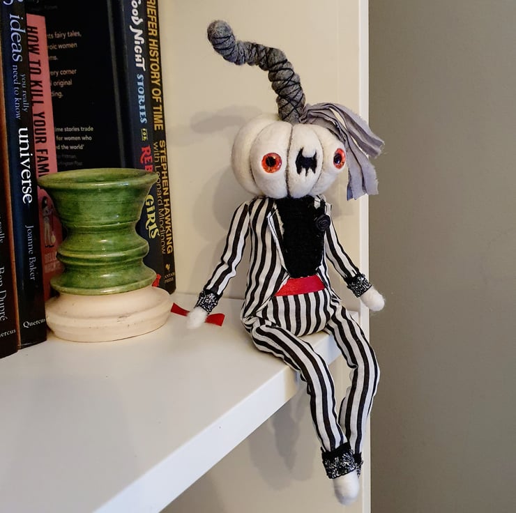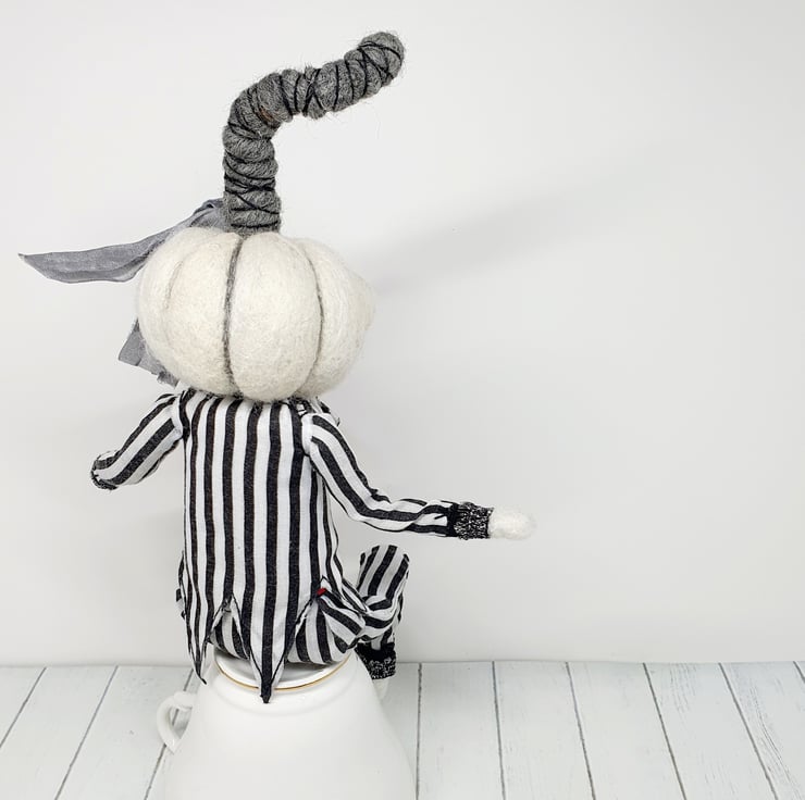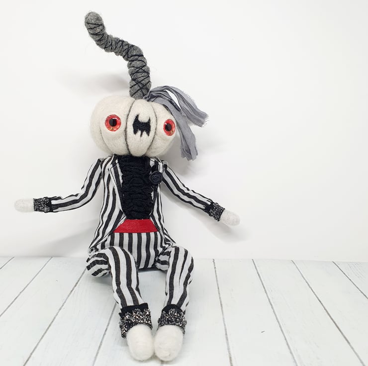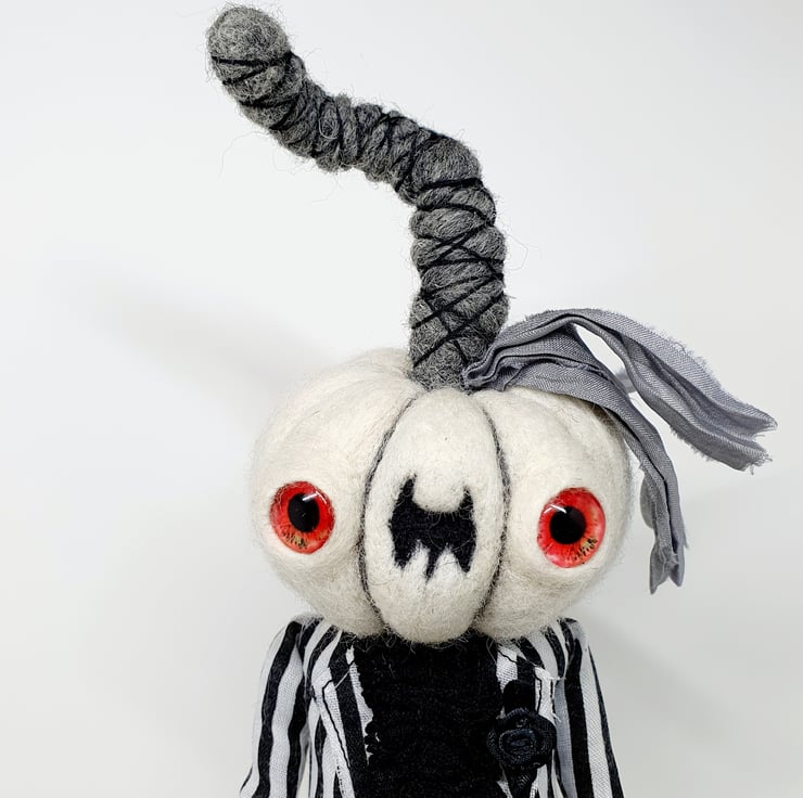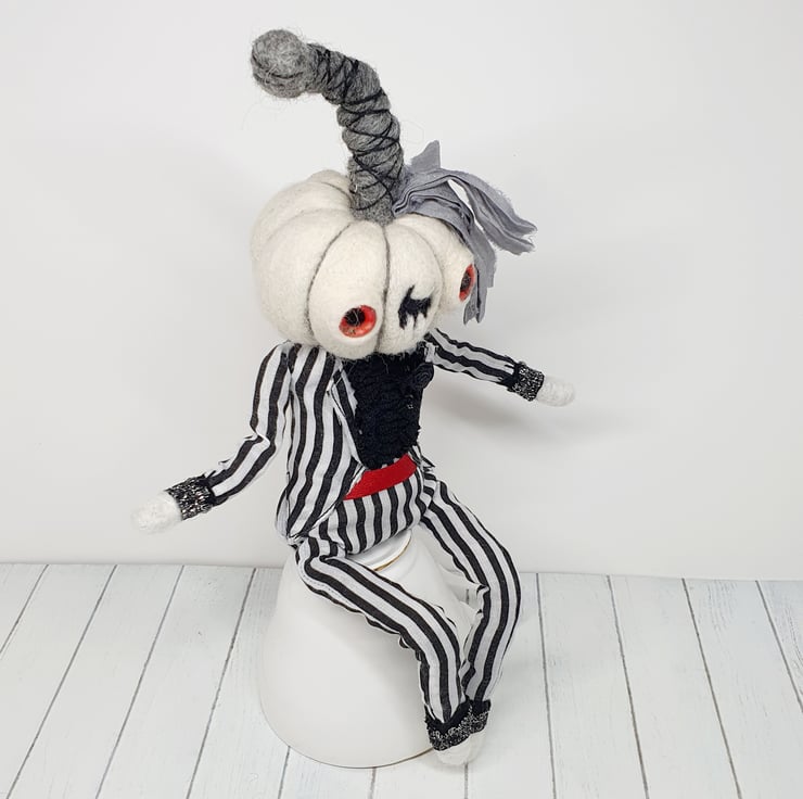 The needlefelted wool pumpkin has glass eyes and is made with natural creamy white yarn. This doll has a wired core and so can be made to pose and sit. Pumpkin wears black and white striped suit with ruffle lace shirt, red satin thread cummerbund and black rose on the lapel. Trousers and shirt are sewn into place and have sparkly trim wrists and ankles. Pumpkin has recycled sari silk foliage and twisty stalk with thread wrap. This is for decorative purposes only, handmade and delicate, with care it should last for many spooky seasons to come. Pumpkin measures roughly 30cm tall. This is not a toy.