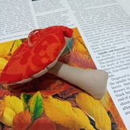 Designed to look like a traditional agaric mushroom, this is made with red and white polka dot fabric and has a beige underside and stem. The gills on the underside are machine stitched and the whole mushroom is gently stuffed to give it that special mushroom-y texture and look.