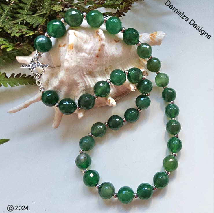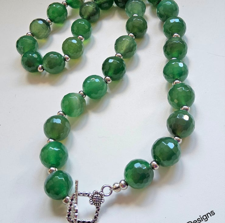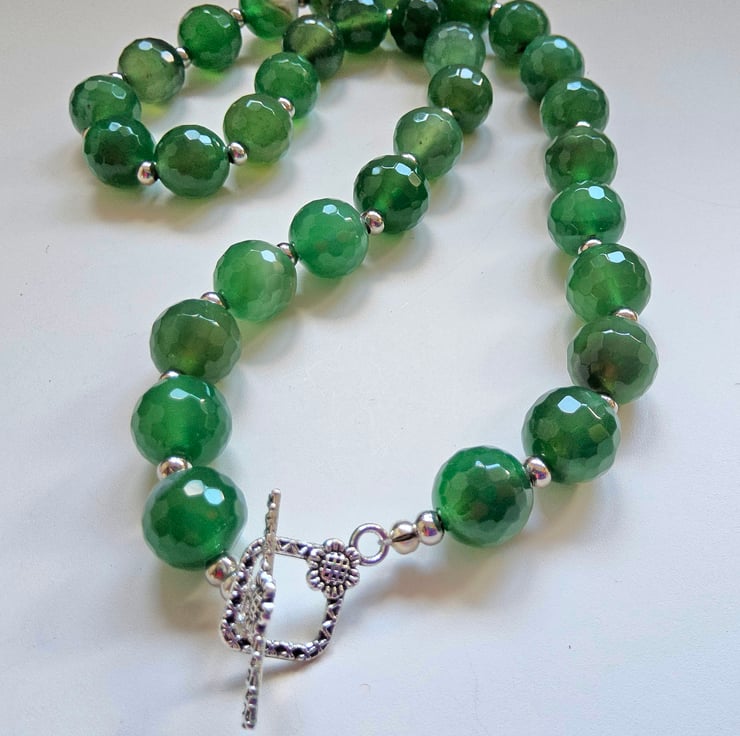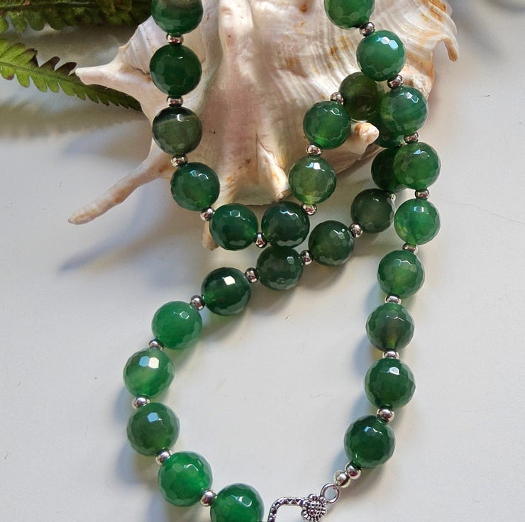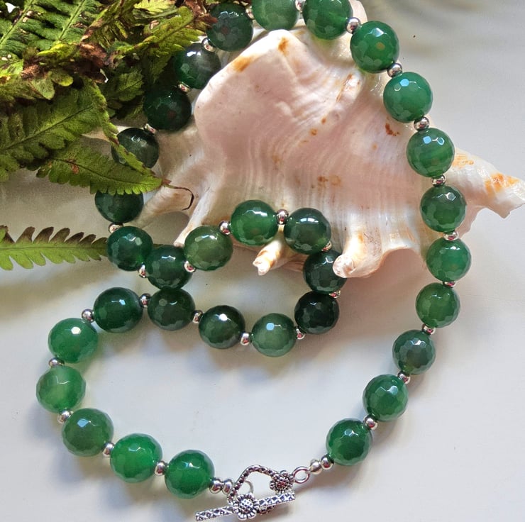 A fashionable affordable statement necklace designed and hand crafted in Cornwall using large 12mm faceted green coloured agate gemstones. To compliment them 2.5mm rondelle silver plated spacer beads sit between each agate. The necklace can be worn with the clasp at the front or back.