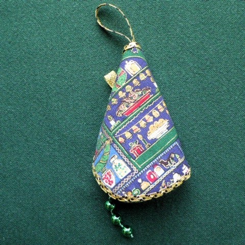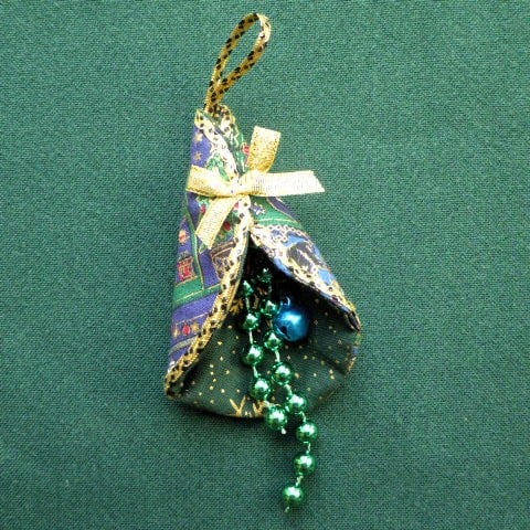 Christmas fabric, braid decorated, hanging bell shapes with beads, ribbon and little bells.
