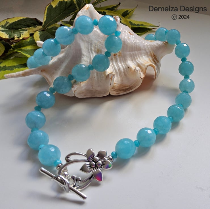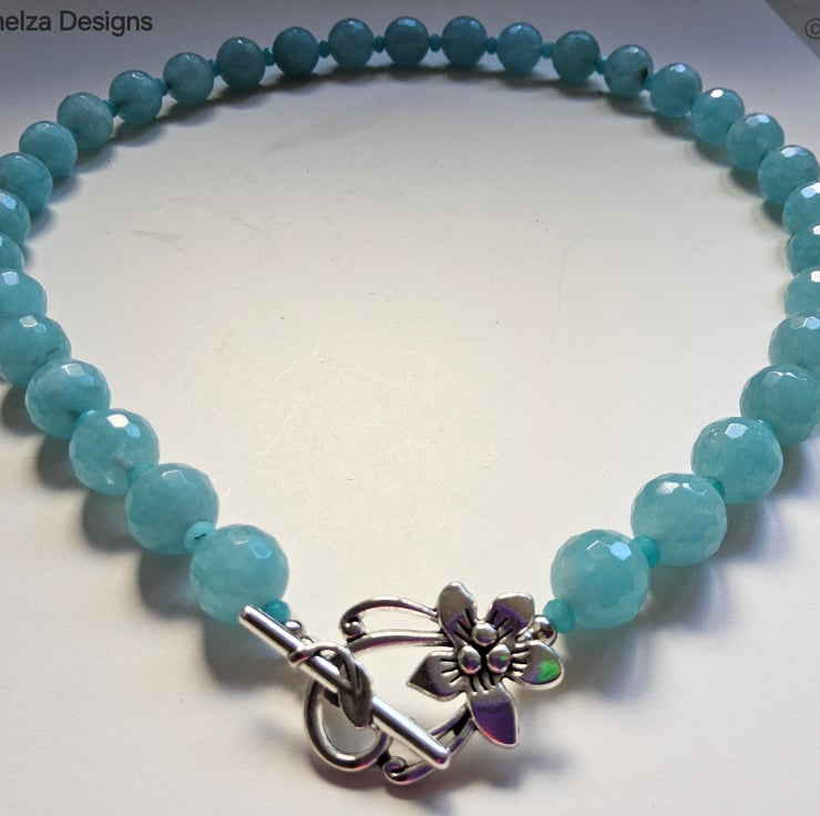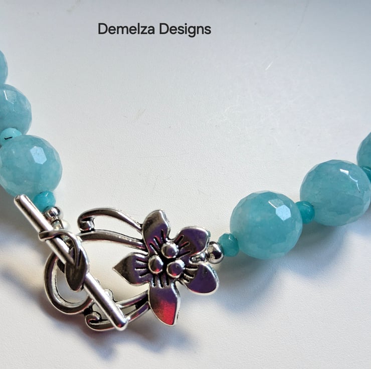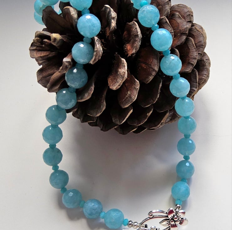 A fashionable affordable statement necklace designed and hand crafted in Cornwall using large 12mm faceted blue coloured agate gemstones. To compliment them 3mm faceted blue rondelle cut blue quartzite gemstone beads sit between each agate stone. The necklace can be worn with the over large statement flower clasp at the front, which is on trend at the moment.
