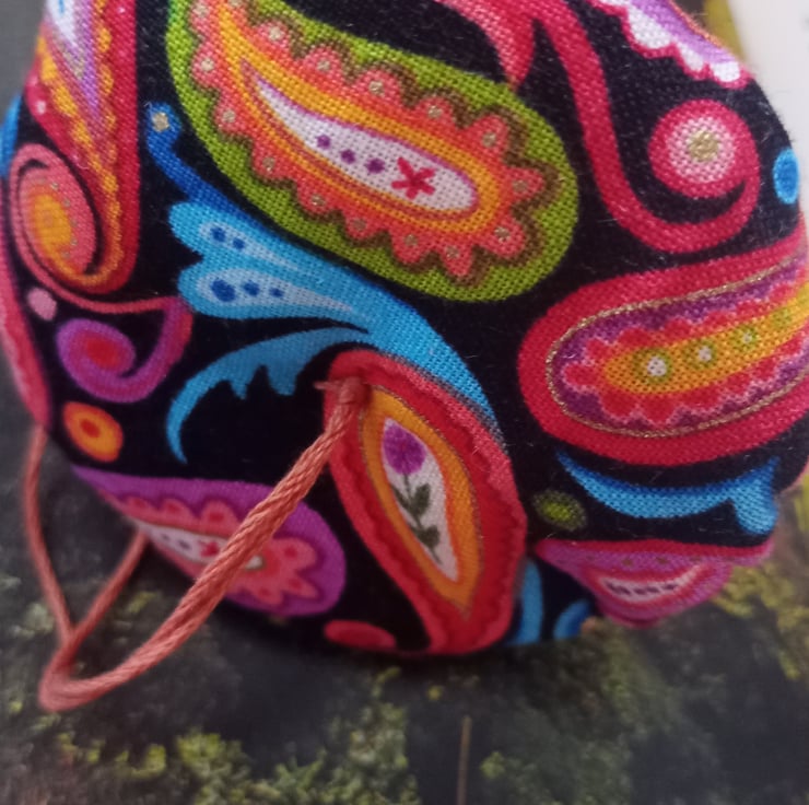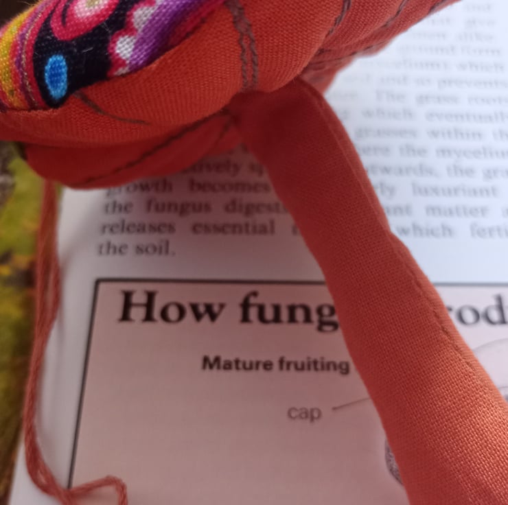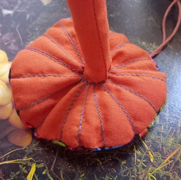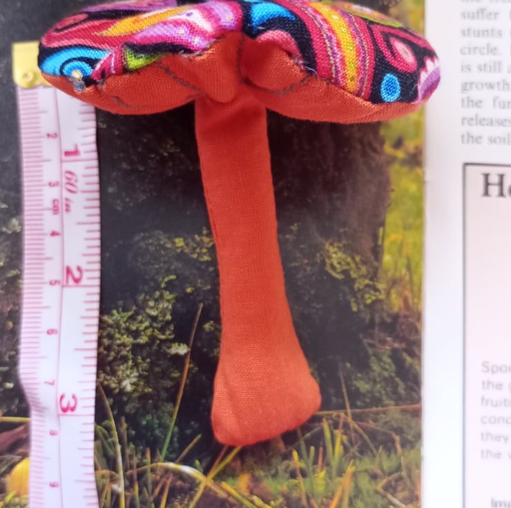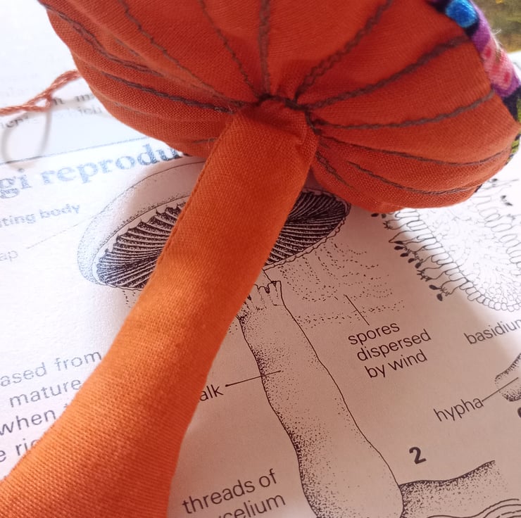 This toadstool has been made from beautiful quilting cotton in a vivid, paisley style pattern featuring lots of colours, and has an orange underside and stem. The gills on the underside are machine stitched and the whole mushroom is gently stuffed to give it that special mushroom-y texture and look. The hanging loop is made from embroidery silk.