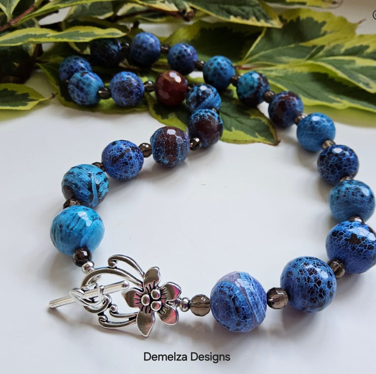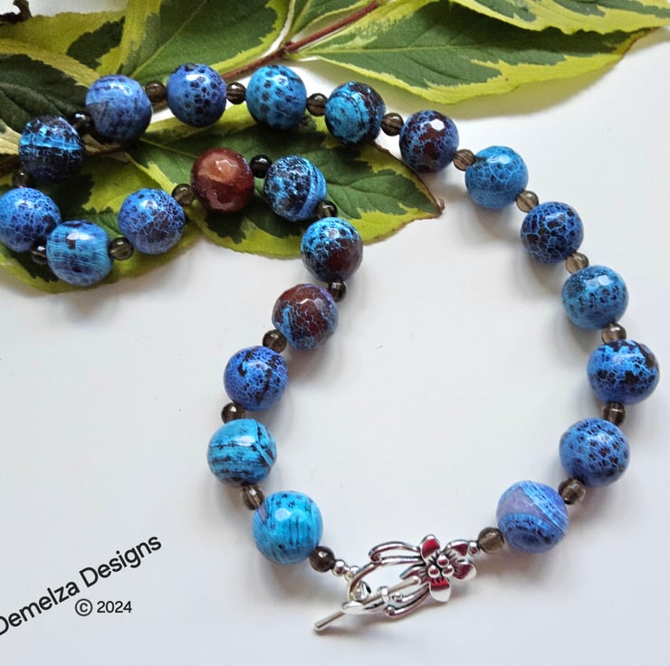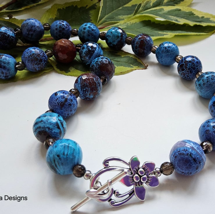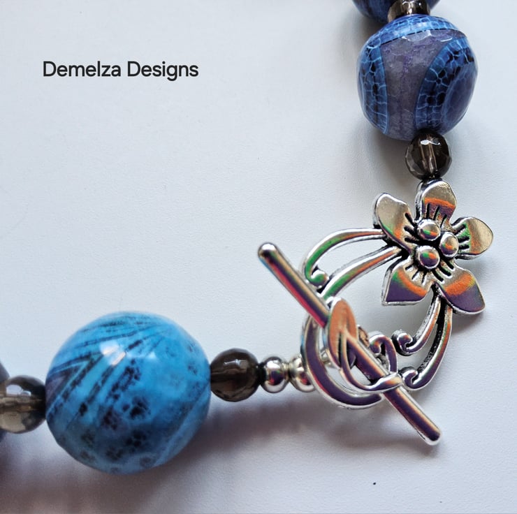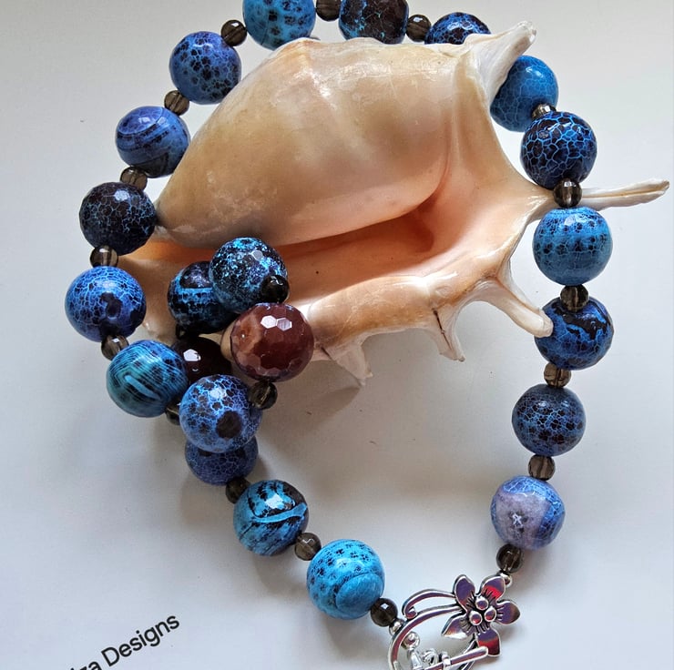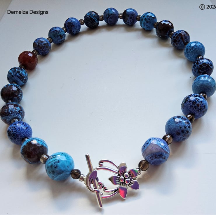 A fashionable affordable statement necklace designed and hand crafted in Cornwall using large 15mm faceted blue/brown coloured agate gemstones. To compliment them 6mm faceted smokey quartz round cut gemstone beads sit between each agate stone. This very fashionable necklace can be worn with the over large statement flower clasp at the front, which is on trend at the moment within the jewellery industry worldwide.